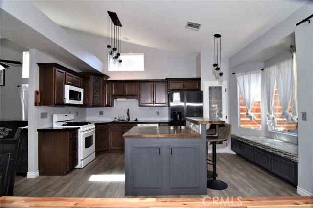JUST REDUCED ! Welcome home to this beautifully maintained single-story gem tucked away on a quiet cul-de-sac in West Palmdale! Featuring 3 bedrooms, 2 baths, and nearly 1,500 sq. ft. of living space, this home offers an inviting open floor plan with vaulted ceilings, a cozy fireplace, and plenty of natural light. The updated kitchen includes modern cabinetry, a breakfast bar, island and a charming bay window perfect for morning coffee. Tile flooring throughout the main living & Dining area and laminate flooring throughout the hallway, bedrooms & laundry room. Enjoy outdoor living under the covered patio overlooking a spacious backyard—ideal for entertaining, relaxing. Conveniently located near Highland High School, shopping, and commuter routes, this property combines comfort, convenience, and curb appeal. Also includes the brand new electric car charging system. Move-in ready and full of charm — don’t miss this West Palmdale beauty!