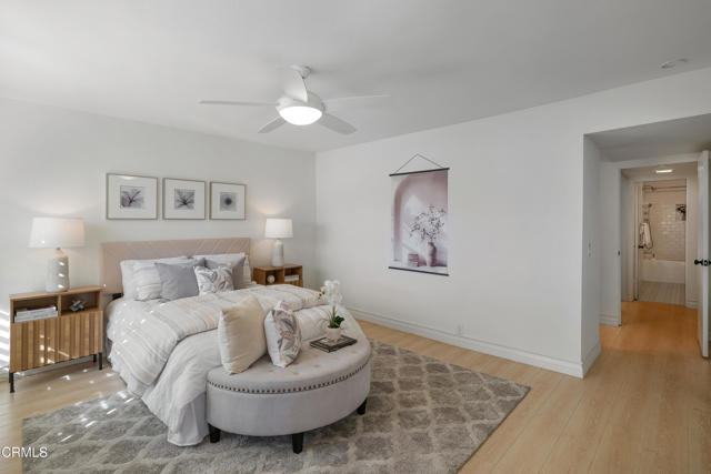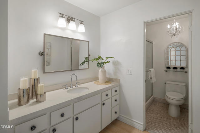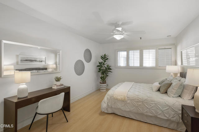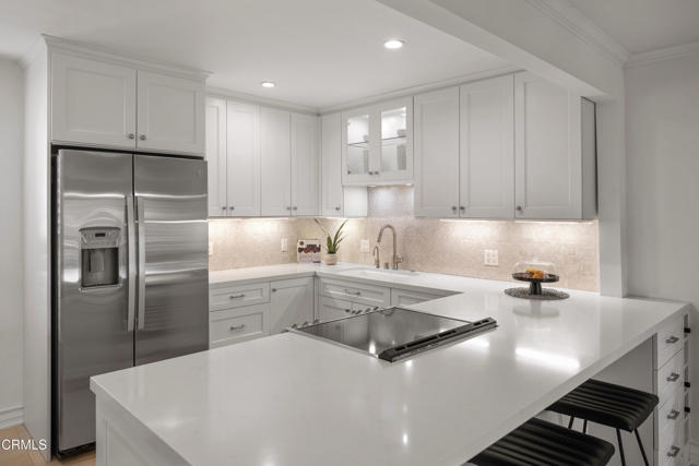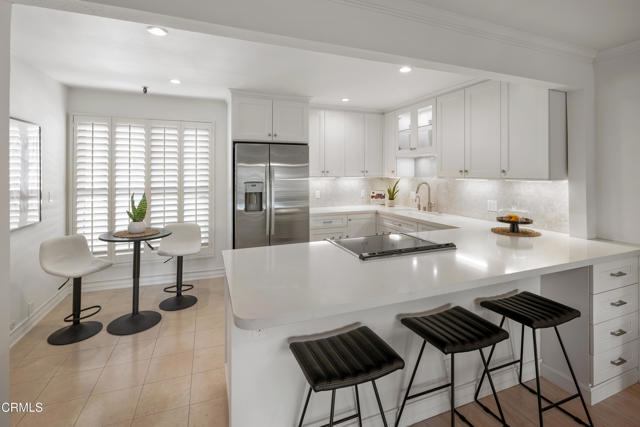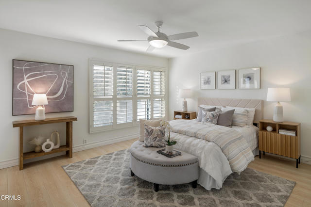 Set within a tree-lined neighborhood surrounded by classic Pasadena architecture and just moments from the famed Gamble House, this thoughtfully updated top-floor condo combines timeless charm with modern comforts. Upon entering, you're welcomed by elegant herringbone-pattern tile flooring that sets the tone for the home. To the left of the entry, the updated kitchen features recessed lighting, crown molding, and stainless steel appliances, including a 5-burner electric induction range. A custom-tiled backsplash, under-cabinet lighting, and a convenient eat-at quartz countertop create both style and function. The kitchen opens seamlessly to the dining area and living room, enhanced with crown molding and wood-like laminate flooring throughout. Off the living room, sliding glass doors with wood-louvered shutters lead to a spacious balcony with peaceful views of the Arroyo and the rolling hills of Linda Vista. Continuing straight from the entry, you'll find a closet and a charming dry bar with cabinets and accent lighting. To the right, the hallway leads to two bedrooms and two bathrooms. The first full bath offers a deep tub and shower combination with subway tile to the ceiling, along with an oversized single-sink vanity topped with quartz. Adjacent sits the first bedroom, complete with a mirrored closet, ceiling fan, and wood shutters. Hallway linen cabinets and a utility closet provide extra storage. The primary suite is a private retreat with dual mirrored closets, a ceiling fan, and balcony access overlooking the pool and hillsides. The ensuite bath includes an oversized single-sink vanity with stone countertops, one inch Carrara marble hexagon tile flooring, and a glass-enclosed shower. Additionally, this well-maintained gated community offers a private gated pool and lounging area. Also, just outside the building there is trail access leading down to Brookside Park, Brookside Golf Course, and the iconic Rose Bowl where you can enjoy the occasional fireworks, seasonal events, and outdoor recreation. Plus you are only moments away from all the shops, dining, and entertainment of Old Town Pasadena.