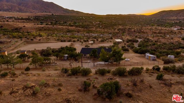 Nestled amidst the captivating High Desert Hills, just adjacent to the Angeles National Forest and a renowned national park, lies this approximately 2.5-acre equestrian property at 29243 Piani Road in Pearblossom. This modern ranch home offers over 2,000 square feet of living space, designed to capture breathtaking sunsets from the elevated position of the back of the house that faces west, showcasing a serene retreat in a stunning setting. The home encompasses three bedrooms, a versatile office/flex room, and two bathrooms, each with double sinks and bathtubs. Designed for comfort and practicality, it features vaulted ceilings and an array of custom finishes, including brick and wood floors in the kitchen and dining room, complemented by Turkish Travertine in the Venetian Pattern in other living areas. Large windows fill the space with natural light and showcase the picturesque views. A separate outside entrance to the primary bedroom and the dining room, as well as a utility room entrance, underscores the thoughtful design of this home. The 2-car attached garage provides ample storage space, with additional storage available in the attic and a large utility room pantry. Say goodbye to high electricity and water bills, as this home is powered by a high-quality paid-off solar system with 26 panels installed by Solar Optimum in 2022, and water sourced from its own well and propane for gas. In addition to central heating, this home is equipped with a whole-house evaporative cooler, a highly energy-efficient alternative to traditional air conditioning. The dining room also features a wood-burning stove for cozy winter evenings. The private, fully fenced lot, with its 330-foot frontage on Piani Road, is complemented by a wooden ranch gate, creating an impressive entrance to this serene retreat. With RV hookups and ample outdoor storage, this property accommodates a variety of needs, whether for ranch living or leisure. Equestrian facilities abound, with a 120' x 96' arena, a 50' round-pen, and a spacious hay barn capable of accommodating a full semi-truck load. The property supports multiple horse stalls with water and electricity, ensuring your equine companions enjoy optimal care. There is also a Nelson Automatic waterer in the pasture area. Beyond its equestrian amenities, the property is steeped in nature, providing direct access to miles of trails and seasonal creeks. It is conveniently located approximately five miles from local amenities, including the USPS, LA County Fire Department, and Pearblossom Park. Embrace the opportunity to own this equestrian property, where natural beauty, modern comforts, and horse-friendly facilities converge. Whether you are an avid equestrian or seeking a tranquil retreat, this home offers a unique chance to live in a truly stunning setting.