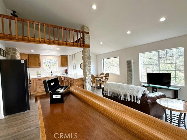 Private Mountain Retreat with Stunning Views and Greenbelt Setting Nestled in the scenic community of Pine Mountain Club, this beautifully updated 2-bedroom, 2-bath home combines modern design with classic mountain warmth. Backing to protected greenbelt land, it offers exceptional privacy and uninterrupted views of the surrounding forest and peaks. The upper level features an open-concept living area with vaulted ceilings, large windows, and a wood-burning fireplace. A fixed metal ladder leads to a cozy loft, ideal for reading, creative projects, or extra guest space. Entertain easily with a built-in wet bar, or relax on the full-length deck while taking in the peaceful views with no neighboring homes in sight. The kitchen features quartz countertops, custom natural wood cabinetry, a copper farmhouse sink, and hand-hammered copper accents on the range hood and backsplash. Both bathrooms have been thoughtfully updated with modern fixtures, sleek vanities, and contemporary gray tile. The primary suite includes a second wood-burning fireplace for cozy evenings. The lower level provides a welcoming entry, laundry area, and additional storage, while a concrete driveway offers convenient parking. Residents of Pine Mountain Club enjoy access to a 9-hole golf course, tennis courts, swimming pool, clubhouse, equestrian center, and miles of hiking and biking trails within the Los Padres National Forest. Whether you’re seeking a full-time home, a weekend retreat, or a peaceful escape from city life, this property offers the perfect balance of comfort, style, and natural beauty.