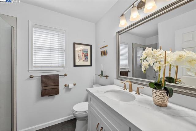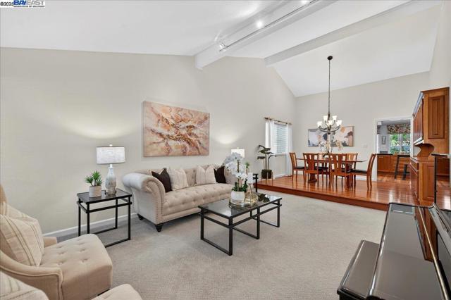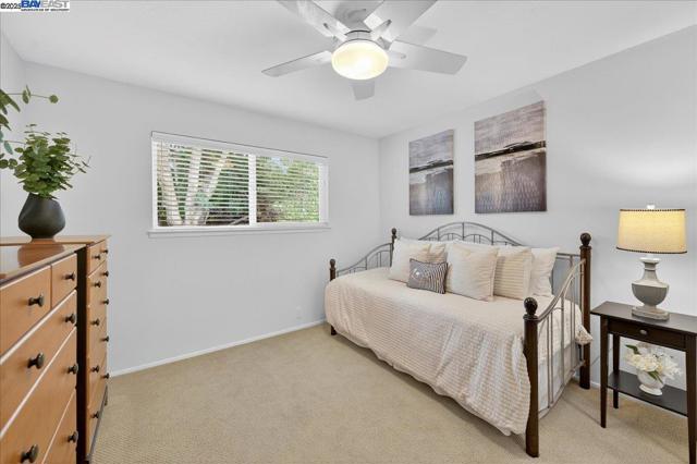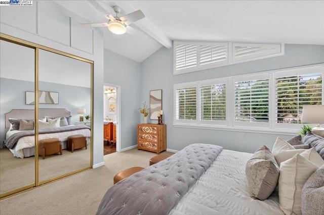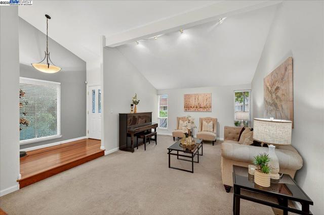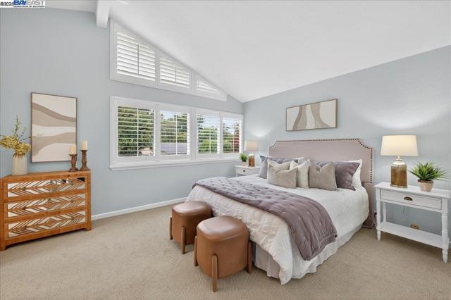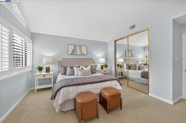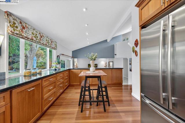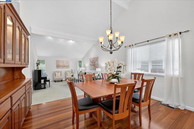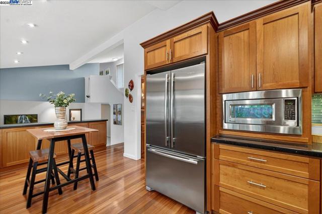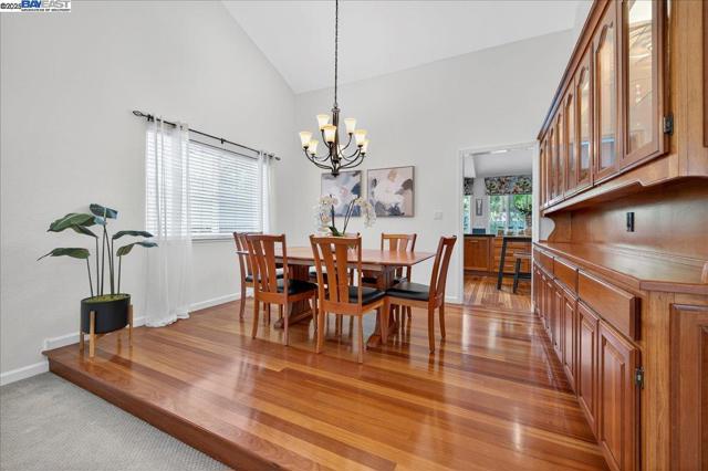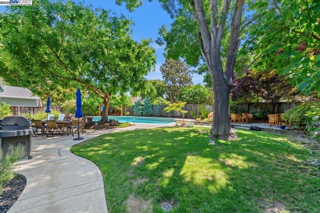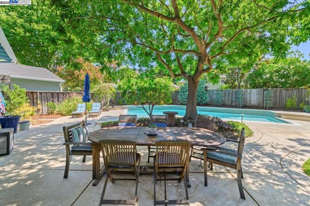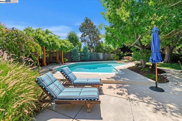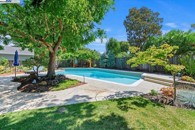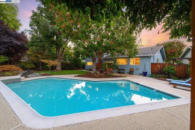 Beautifully renovated west-facing home in the heart of the highly desirable Pleasanton Valley neighborhood! Step through the leaded glass front door to find Brazilian Cherry wood floors and a formal living room with vaulted ceiling that flows seamlessly into the dining room, highlighted by a custom lighted built-in cabinet. This spacious home features a convenient full bedroom and bath on the main level, plus a stunning granite kitchen with rich Cherry wood cabinetry, stainless steel appliances including a gas range, refrigerator, and built-in microwave. The kitchen opens to the inviting family room with a cozy wood-burning fireplace, creating the perfect space for everyday living and entertaining. Updated bathrooms showcase stylish new cabinetry, fixtures, lighting, and tile flooring. Thoughtful upgrades include newer HVAC, water heater, dual-pane windows, Plantation shutters, and fresh exterior paint for added peace of mind. Outside, enjoy your private backyard retreat with a large patio for entertaining, a sparkling pool, and a wisteria-covered arbor offering shaded relaxation. A second garden patio beneath mature trees provides even more room to unwind. Walk to nearby parks and award-winning K-12 schools, with easy access to 680/580, BART, and ACE train. This one has it all!