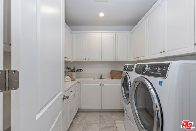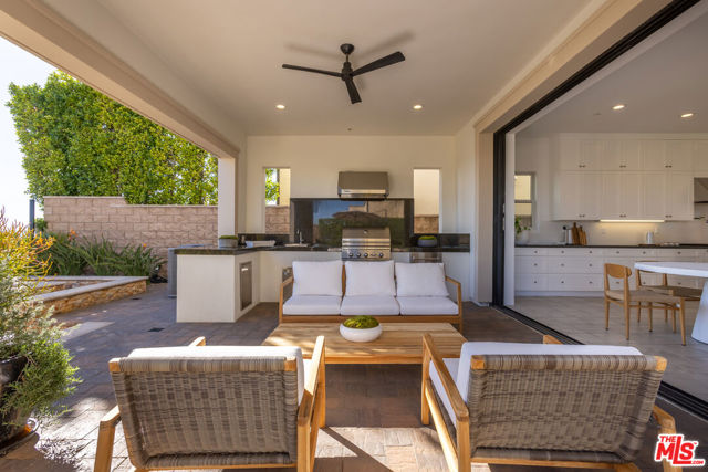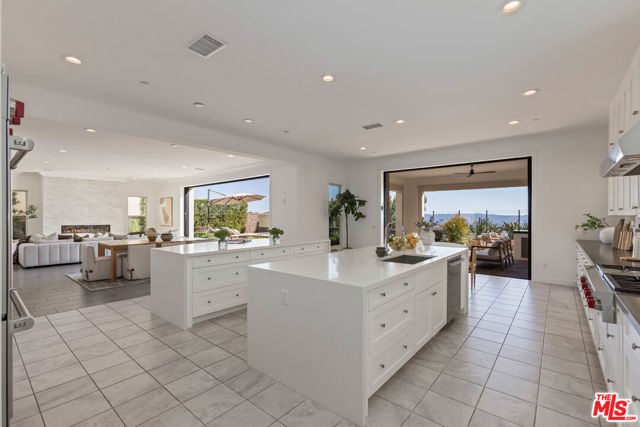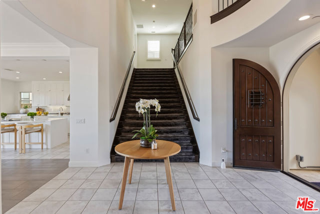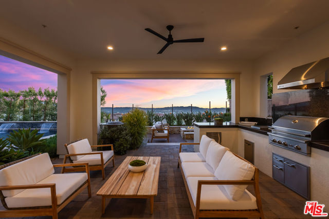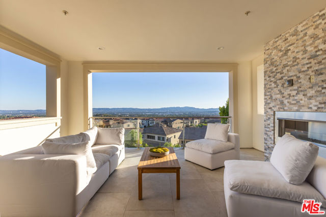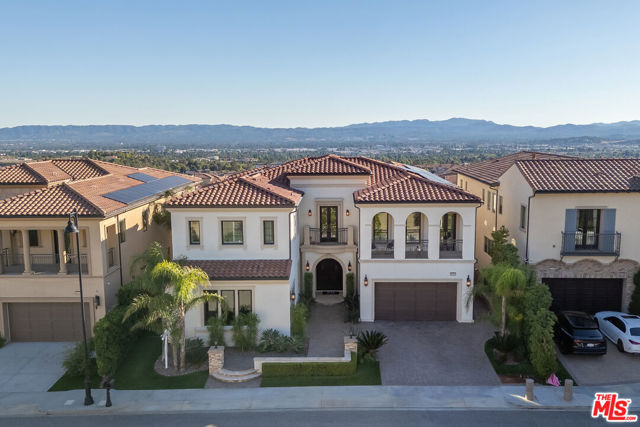 Perched atop a hill within the prestigious, guard-gated community of Westcliffe at Porter Ranch, this newly reimagined five-bedroom, five-and-a-half-bath residence offers sweeping city and valley views. The impressive foyer opens to a bright, airy floor plan where the expansive living room, formal dining area, and Chef's kitchen blend seamlessly. Two large pocket sliding doors vanish into the walls, extending the interior into the beautifully landscaped backyard, complete with pool, spa, fountains, outdoor kitchen, and fire pit. The sizable Chef's kitchen features dual waterfall islands, premium WOLF appliances including dual ovens and a built-in coffee station, a SubZero refrigerator, bespoke cabinetry, and a large walk-in pantry. A main-level office, converted gym, and guest suite ensure privacy for visitors. Upstairs, a spacious bonus room offers endless possibilities as either a media room, a home office, or a play area. The grand primary suite is complete with a private balcony featuring a cozy fireplace that overlooks the valley below. The spa-like ensuite bath showcases a freestanding soaking tub, an oversized walk-in shower, dual vanities, and a large custom closet. Designed with modern comfort and sustainability in mind, the home includes an EV charger and a wholly owned solar system with 45 panels, resulting in near-zero energy costs. Ideally positioned near The Vineyards at Porter Ranch, home to high-end shopping, dining, and entertainment such as Whole Foods, La Popular, and AMC Theater, this Toll Brothers Cahill residence also offers access to acclaimed schools.