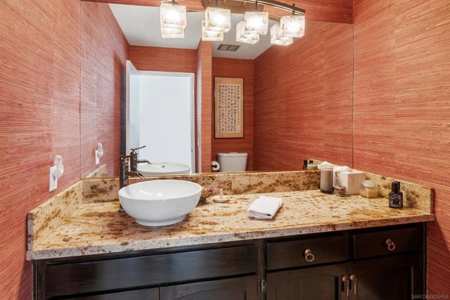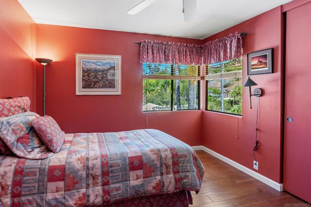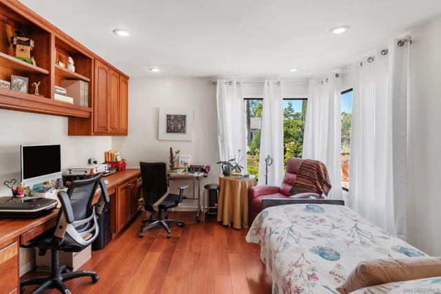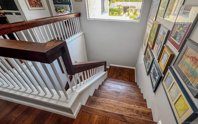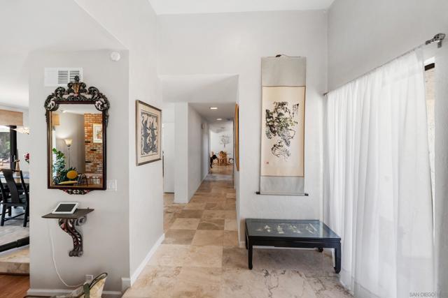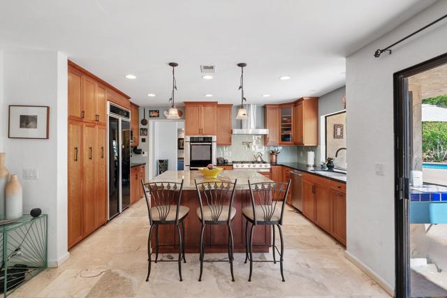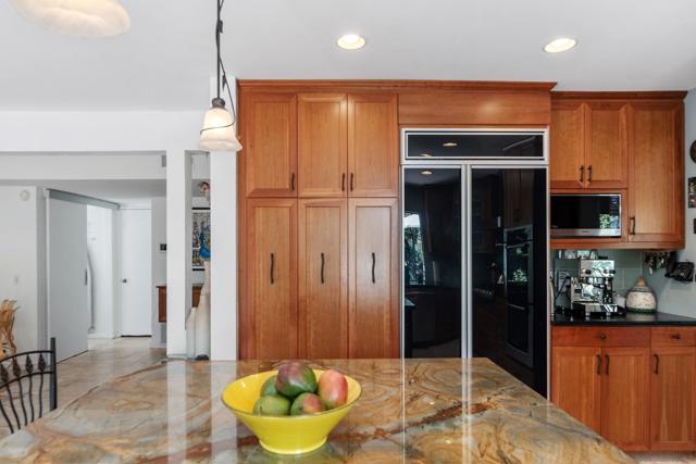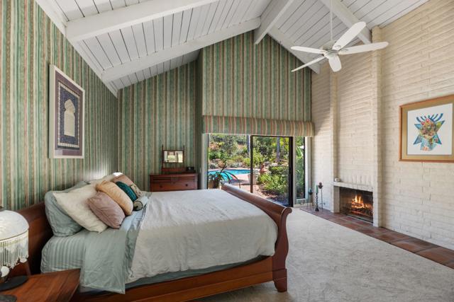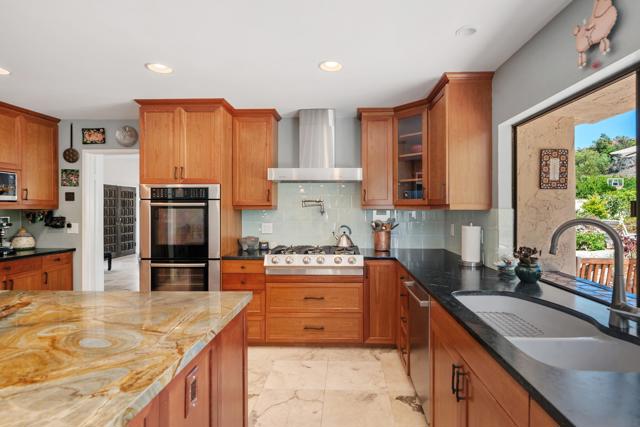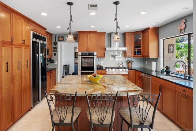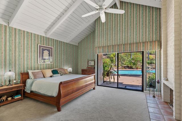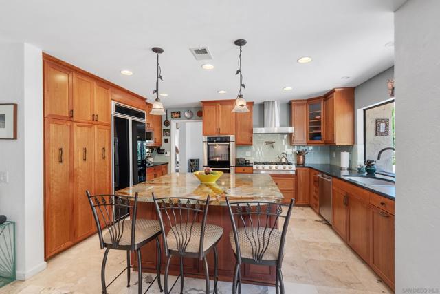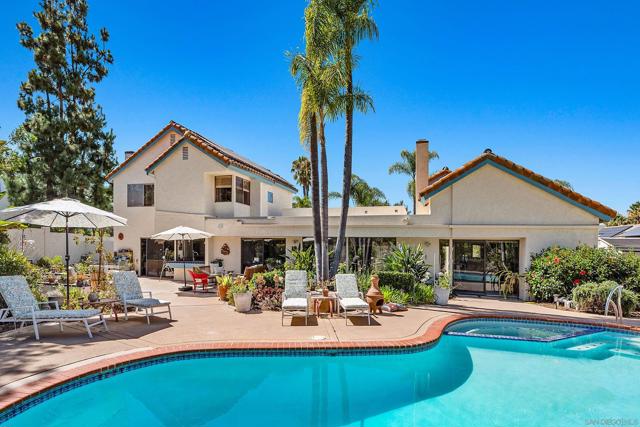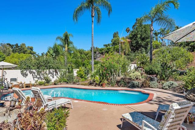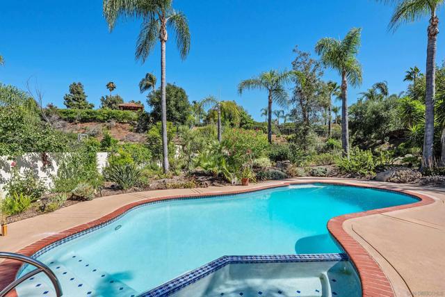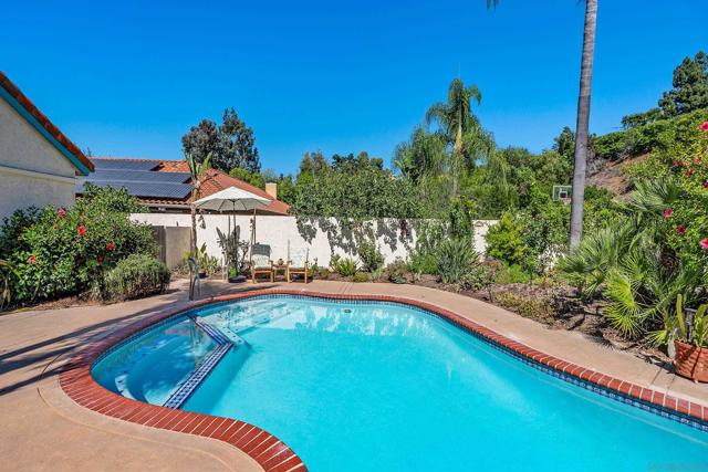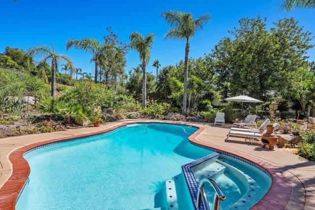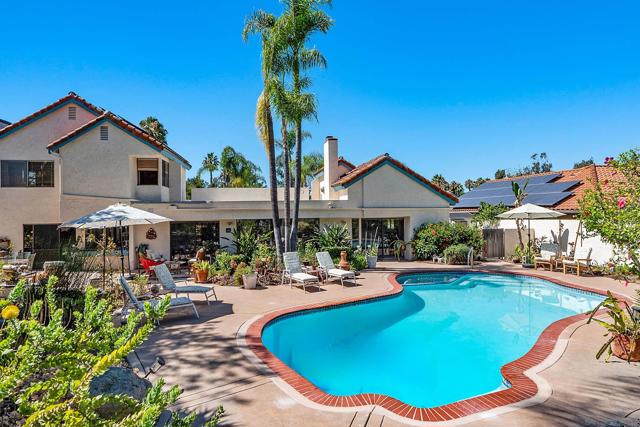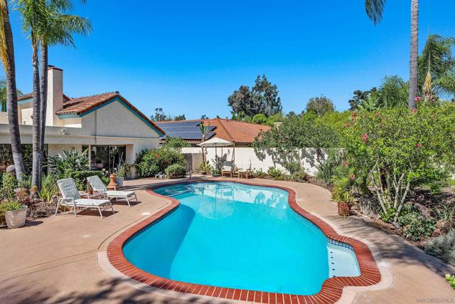 Desirable Silver Saddle Ranch area of Green Valley in Poway! 2 story home with primary bedroom down. Recent upgrades include primary bath remodel, pool resurfacing, new pool equipment, and exterior paint. Other features include OWNED solar, newer roof, beautiful custom kitchen remodel with large island for casual dining, travertine and hardwood flooring, 2nd ensuite bedroom downstairs, and mostly flat, usable .53 acre lot. 3 car garage and Poway schools! See upgrades list in Documents. The primary bath was just remodeled and features a custom shower and freestanding soaking tub. The bath also includes quartzite countertops, dual sinks and a walk in closet. The primary bedroom is downstairs, and is showcased by a white brick fireplace and sliding door to the pool area and backyard. The chef’s kitchen is gorgeous with custom cherrywood cabinetry, high end appliances, including a Bosch 850 Series double wall oven, Fisher & Paykel range hood, Electrolux 6 burner gas range, Bosch 850 Series dishwasher, and a built in refrigerator. The countertops are soapstone and there is an island with beautiful pendant lighting. There are 3 additional bedrooms and a loft area upstairs. The upstairs bath has also been updated. The spacious backyard is over .5 acres with a pool, patio, fruit trees, roses, and room to add an outdoor kitchen, play structure, or whatever suits your needs. Welcome home to Silver Saddle Ranch!