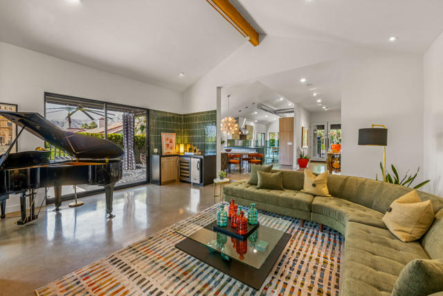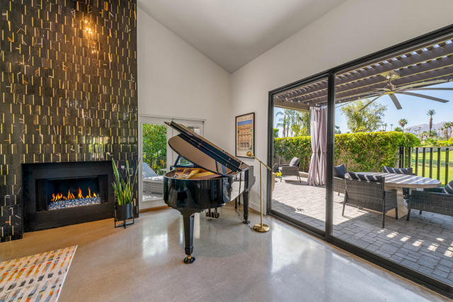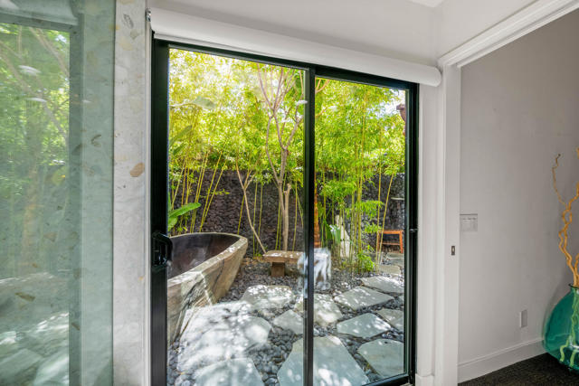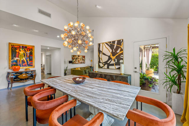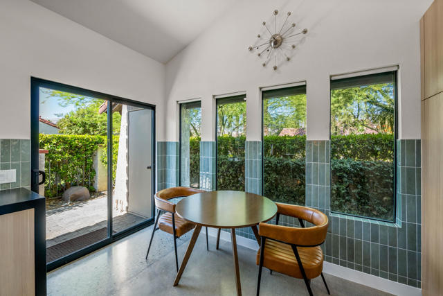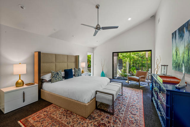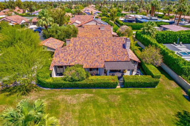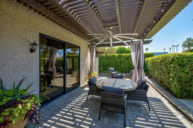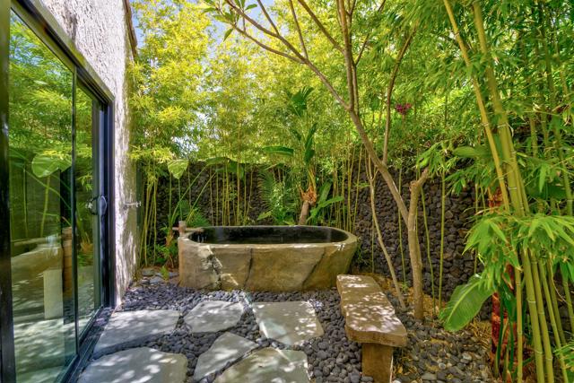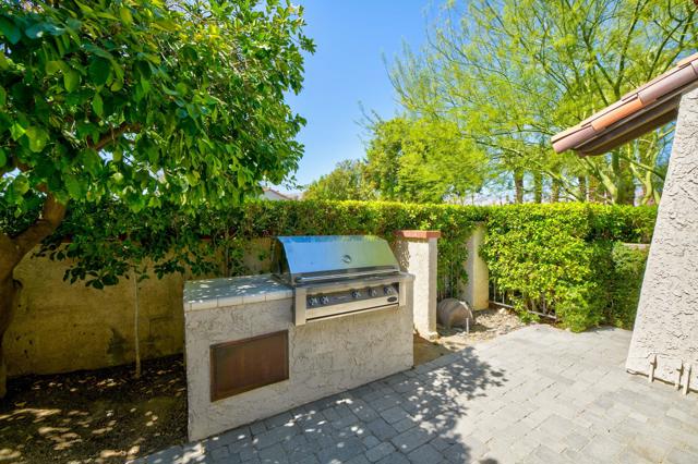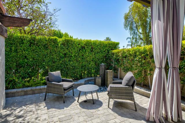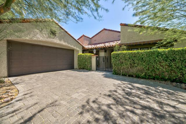 This tranquil desert home exudes Zen from its design, decor and surroundings. It's Prime Location is quiet and private at the back of a lush, gated complex filled with greenbelts. Enter through a gated courtyard. The formal entry leads to a dramatic great room with high vaulted ceilings, elegant dramatic tiled fireplace, tiled bar, and glass doors leading out to multiple patios with views of the huge park-like greenbelt and the surrounding mountains. A statement chandelier graces the large dining area which leads to an exterior patio and al fresco dining in the cabana. Modern cooks' kitchen with vaulted ceiling and stainless steel premier appliances. The home sits at the back of the community next to an expansive manicured greenbelt that is like having your own lawn. 3 ensuite bedrooms all separated from each other give each room privacy. The oversized primary suite retreat has a private outdoor shower and soaking tub surrounded by bamboo. The primary bathroom is large with double sinks and a huge walk-in closet. Each of the other 2 guest rooms are large and comfortable with doors accessing the interior courtyard every room has access to the outdoor spaces. The home has been beautifully altered and designed with a modern sensibility. Newer roof, fountains, art-lights and gallery walls. Newer paving stones line the driveway and outdoors. Plus, there is an astonishingly huge attic that multiple homes have made into a 2nd story or use for additional storage! Immaculate and ready to move right in. Make an appointment to see a home like no other! 3D Virtual Tour and Floor plan with pictures!