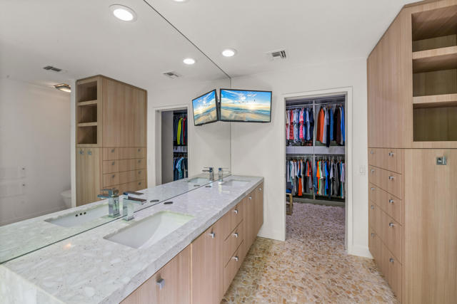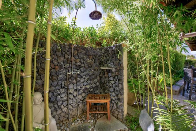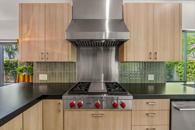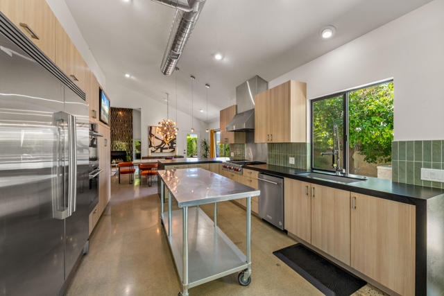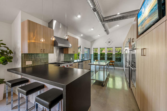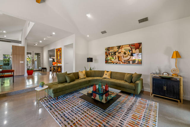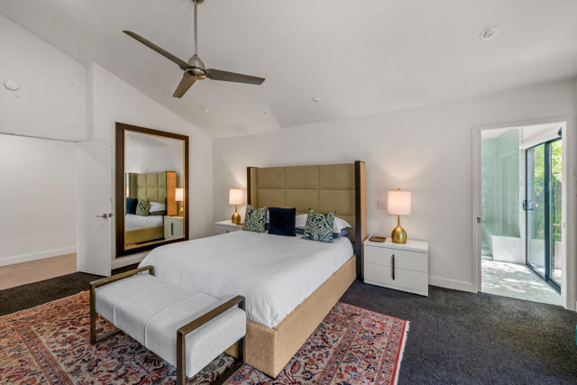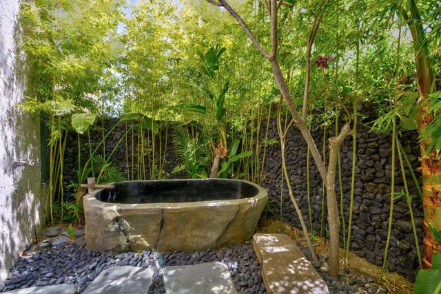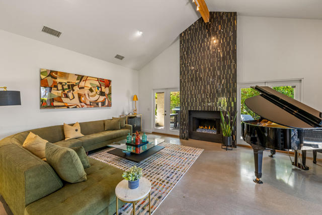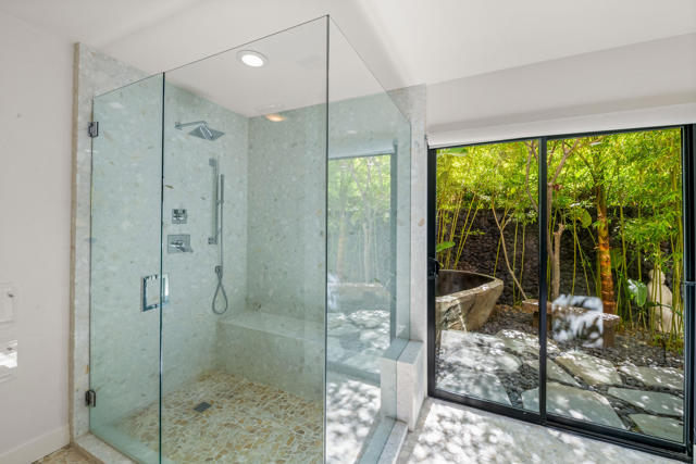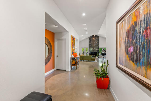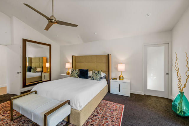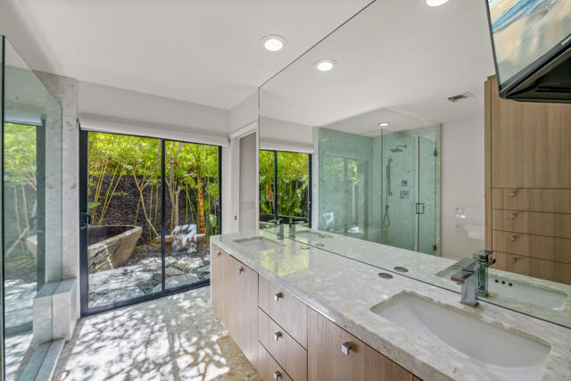 This tranquil desert home exudes Zen from its design, decor and surroundings. It's Prime Location is quiet and private at the back of a lush, gated complex filled with greenbelts. Enter through a gated courtyard. The formal entry leads to a dramatic great room with high vaulted ceilings, elegant dramatic tiled fireplace, tiled bar, and glass doors leading out to multiple patios with views of the huge park-like greenbelt and the surrounding mountains. A statement chandelier graces the large dining area which leads to an exterior patio and al fresco dining in the cabana. Modern cooks' kitchen with vaulted ceiling and stainless steel premier appliances. The home sits at the back of the community next to an expansive manicured greenbelt that is like having your own lawn. 3 ensuite bedrooms all separated from each other give each room privacy. The oversized primary suite retreat has a private outdoor shower and soaking tub surrounded by bamboo. The primary bathroom is large with double sinks and a huge walk-in closet. Each of the other 2 guest rooms are large and comfortable with doors accessing the interior courtyard every room has access to the outdoor spaces. The home has been beautifully altered and designed with a modern sensibility. Newer roof, fountains, art-lights and gallery walls. Newer paving stones line the driveway and outdoors. Plus, there is an astonishingly huge attic that multiple homes have made into a 2nd story or use for additional storage! Immaculate and ready to move right in. Make an appointment to see a home like no other! 3D Virtual Tour and Floor plan with pictures!