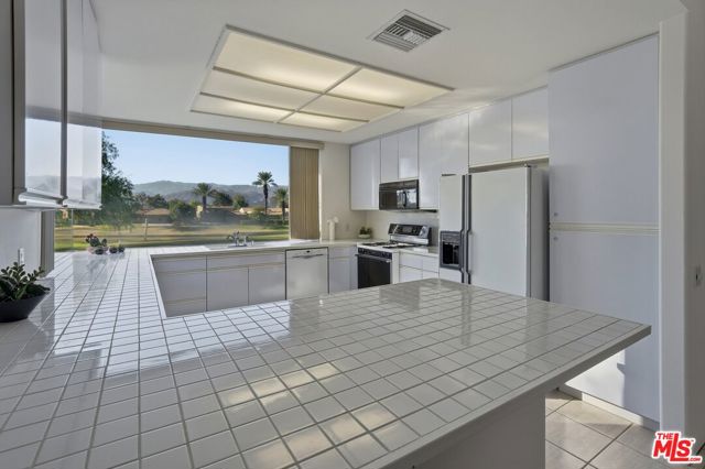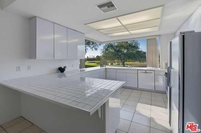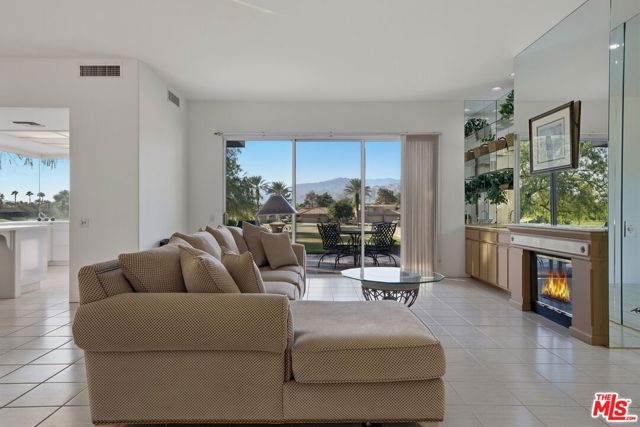 Discover effortless living in the highly sought-after Mission Hills Country Club, where world-class amenities and a prime location near shops and restaurants await. This exceptional property welcomes you with an inviting private courtyard and its beautiful low-maintenance landscaping. Step inside to a well-maintained home featuring a spacious, open floor plan with three bedrooms and two bathrooms. Large windows throughout offer unobstructed views of the golf course, lake, and mountains, allowing for seamless indoor-outdoor living. The bright white kitchen boasts plenty of cabinets, a breakfast bar and stunning golf course, lake and mountain views, framed by a large corner window that draws in natural light. The open living area features a cozy fireplace, a wet bar, and a variety of storage options. It leads to a private patio, perfect for entertaining or enjoying your morning coffee. Or if you are up for a challenging round of golf, the Pete Dye Course is right at your doorstep. The primary bedroom suite offers abundant closet space and an en-suite bathroom with dual sinks, a soaking tub, and a separate shower. The two additional bedrooms are generously sized and share a bathroom. Tile flooring throughout ensures easy care. A dedicated laundry area includes a washer, dryer, and extra shelving. For your convenience, there's a rare three car garage, providing ample storage. Best of all, the fortunate buyer will enjoy land ownership and all the benefits it provides, including the potential to add a private pool. Don't miss this gem and start living your best life in the desert!