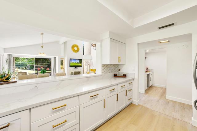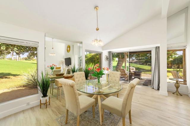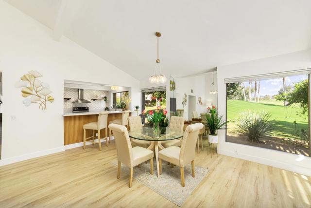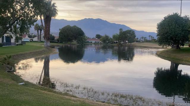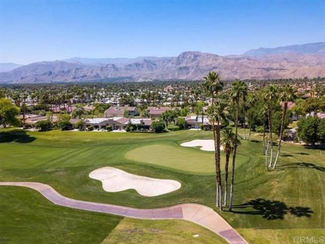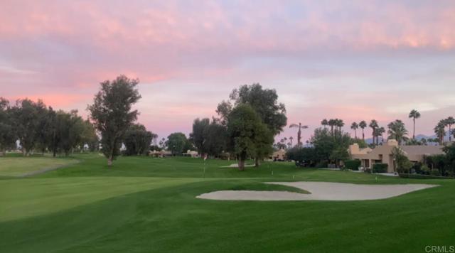Experience Golf Lover's Paradise! Sunny Mission Hills Country Club Townhome 2 bd, 2 ba plus den/office space as 3rd bedroom, single level home with the best unobstructed views of the 16th Hole on the Dinah Shore PGA Tournament course. Enjoy serene sunsets and tranquil mornings watching golfers from your private covered patio. Spacious interior boasts vaulted ceilings, large kitchen, and modern finishes. Newly remodeled, quartz counters, LVP flooring, elegant chandelier & fixtures, & new AC Compressor. Private end unit with the best views of greens! Peaceful Guard Gated Community with pool and jacuzzi. Home has 2 covered carport spaces and storage closets. Cable/Internet included with HOA. The Country Club features three 18 hole golf courses, 43 racquet sports courts, croquet, state of the art fitness center and dining. Land Lease extension to 2121 is available & conventional lending options. Conveniently located near Gelson's, Casino, The River, and Eisenhower Hospital. Palm Springs Airport is just 15 minutes away. Turnkey for your enjoyment!
