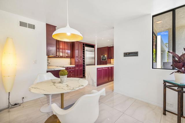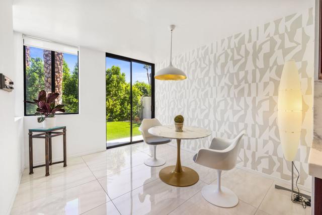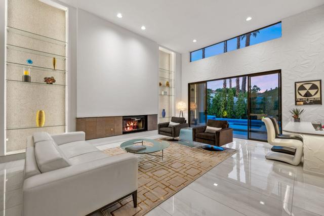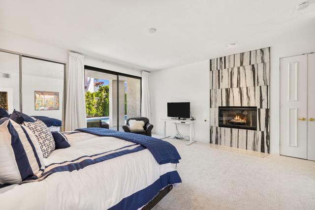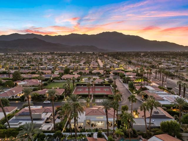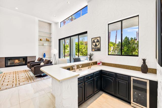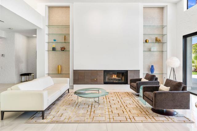 Your desert retreat awaits in Mission Pointe. This architectural modern home is one of five custom homes within Mission Palms, unlike any other in the development, and was one of the original custom homes. It features 3 bedrooms, 4 baths, and a courtyard entry on a 10,000+ sq ft lot with beautifully landscaped grounds and designer outdoor lighting. A pebble tech pool and spa are surrounded by mature palms, greenery, and generous lounge areas, creating a private outdoor oasis.Inside, Italian porcelain tile floors flow through high-ceilinged spaces, including a dramatic living room with a custom fireplace accented by Michael Aram handmade tile. Walls of glass sliders connect every room to multiple outdoor living areas. A Palm Springs-style sunken bar anchors the open living/dining/entry gallery, while the island kitchen offers leathered stone countertops, premium appliances, and an adjoining breakfast/lounge area.Each of the three ensuite bedrooms includes a walk-in closet. The main suite features a custom-lit California Closet and spa-like bath with Italian mosaic tile. Additional highlights include designer finishes, LED art lighting, and an immaculate two-car garage with epoxy floors, built-in storage, and a dog wash station. Low-HOA community amenities include a fitness center, pickleball, and tennis. Centrally located with easy access to Palm Springs and the valley's best, this former model home is move-in ready.