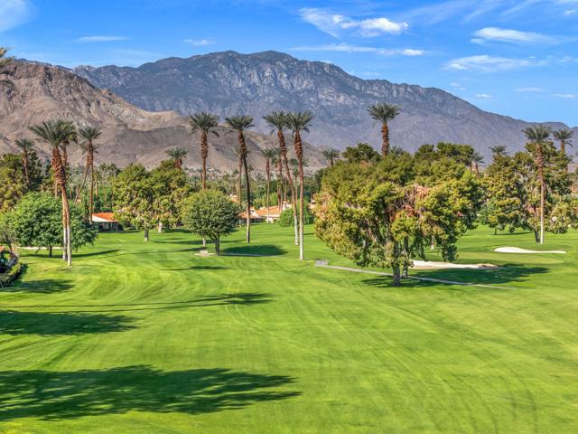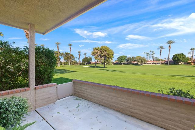 Outstanding END UNIT with FIREPLACE in beautiful Sunrise C.C. Secluded courtyard patio with epoxy finish, fountain and mature landscaping. DOUBLE fairway views of the 12 and 13th holes. Across the street from huge greenbelt and community pool and spa. Quality renovation and upgrades including floors, cabinets, doors and windows, stainless appliances, plumbing fixtures and lighting. Garage has epoxy floors and loads of quality white cabinets. Updated AC, furnace and water heater, including AC in garage. Replaced garage door (insulated) and opener. GREAT location, END UNIT, easy access to BOTH gates and clubhouse, amenities. MIGHT be the BEST 1 bedroom unit ever offered in SUNRISE, see for yourself! Sunrise is the perfect location: surrounded by public AND private golf and tennis, 15 minutes to Palm Springs, 10 minutes to El Paseo.