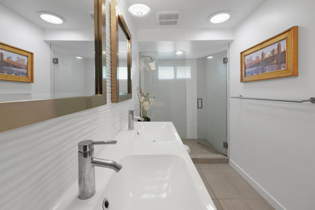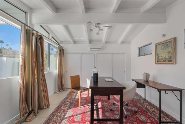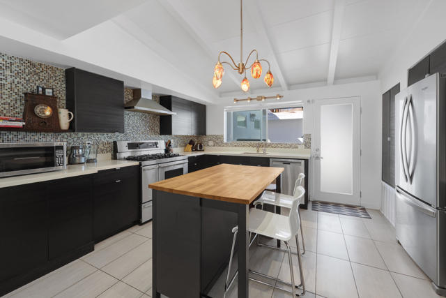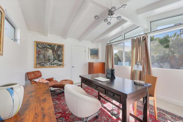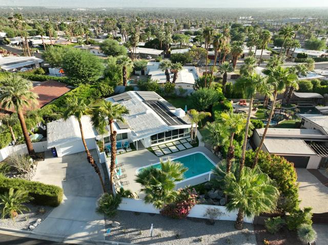 Newly improved and ready for move-in, this stunning 1956 example of Mid-Century Modern architecture has returned to the market in Rancho Mirage's Magnesia Falls Cove. Designed by the legendary Alexander Construction Company and built by television and radio star Art Linkletter, the model-caliber residence offers exceptional privacy, gorgeous mountain views, and an ideal mix of period-perfect and on-trend appointments. Approximately 2009 square feet with three bedrooms and two upgraded baths, the single-level design reveals the open, bright and seamless living spaces that continue to draw so many to MCM style. Its former ADU has been restored to an attached two-car garage with air-conditioning that can serve as a studio, gym, office and more. Floor-to-ceiling windows frame pool and mountain vistas in a spacious living room with stone fireplace and a dining room that opens to an intimate patio. Cut the commute by conducting business in a view-enhanced office at the front of the home, and embark on culinary adventures in an open kitchen that displays Caesarstone countertops, custom cabinetry, a full mosaic-tile backsplash, and stainless steel appliances including a wine refrigerator and five-burner range with double oven. Start and end each day in the privacy of a chic primary suite with generous proportions, an ensuite bath and ample closet space. Vaulted ceilings lend an airy vibe throughout, and tile flooring, new paint, custom lighting, OWNED solar system, dual-pane Solarban windows and a recently resealed roof are featured. A grand homesite extending approximately 13,068 square feet presents a walled and gated front yard with panoramic views, a swimming pool, custom rockscapes and turf-and-concrete patios for impressive entertaining. The backyard offers a private oasis with fragrant citrus trees and large lawns, and the driveway welcomes generous off-street parking. Residents of Magnesia Falls Cove appreciate its quiet ambiance, which belies a location that is remarkably convenient to shops, restaurants and theaters at The River, the opulent Sensei resort, renowned golf courses, and countless attractions in Palm Springs and Palm Desert.