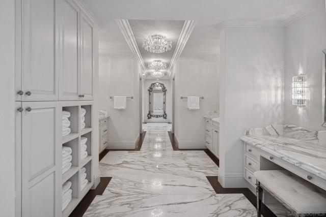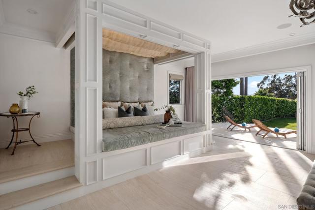 Set along a commanding hillside behind private gates in Rancho Santa Fe’s prestigious enclave—the Covenant—this grand estate blends classic RSF character with timeless European influence. A dramatic grand entry sets the tone with imported Italian limestone floors, custom molding, and crystal chandelier. Stroll through the gallery framed by limestone columns into a massive open living space and marble-clad chef’s kitchen featuring Sub-Zero refrigeration, dual Miele dishwashers, and seamless Savant Pro audio integration throughout. Crafted entirely for royalty, the estate pairs indulgence with innovation through a wine cellar, dedicated cigar lounge, and full smart-home system. The primary suite offers a showroom-style closet, a spa-inspired marble bath with soaking tub and dual shower, two fireplaces, and a private balcony overlooking Rancho Santa Fe’s rolling hills. Step outside to an entertainer’s dream: resort grounds with a dramatic pool and elevated spa framed by manicured hedges, swaying palms, and unobstructed western views that come alive at golden hour. The great room and cabana rooms offer seamless indoor-outdoor flow for lounging or hosting with ease. Generous grounds invite your imagination—plans already call for a detached guest casita and a championship-grade pickleball court to elevate the estate even further.