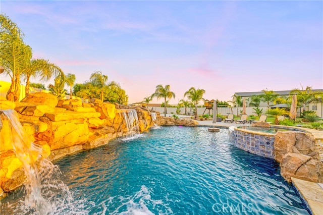 Experience unparalleled luxury in the prestigious Estate Collection at Woodcrest. This sprawling 6-bedroom, 4-bath residence sits on just under an acre in one of Riverside’s most sought-after communities. The downstairs primary suite offers a serene retreat with a spa-inspired ensuite bath and a custom walk-in closet featuring built-in shelving and a glass-topped island display. Upstairs, a spacious loft and four additional bedrooms—including two that share a Jack-and-Jill bath—provide the perfect layout for family living. A private downstairs office offers a quiet workspace for remote professionals. Thoughtfully upgraded throughout, the home features a Klipsch® home theater system, whole-house Waterboy® filtration, smart Lorex® security, and owned SunPower® solar panels for energy efficiency. Step outside to your private resort—an entertainer’s paradise designed for year-round enjoyment. The PebbleTec® saltwater pool and spa shimmer under the California sun, accented by three cascading waterfalls and a built-in slide. A freestanding pavilion anchors the backyard with a designer outdoor kitchen and bar, complete with a pizza oven, built-in BBQ, sink, refrigerator, multiple TVs, ceiling fans, and surround sound. Whether hosting lively gatherings or relaxing poolside, this space delivers the ultimate in outdoor living. The grounds also feature a basketball half-court (pickleball-ready), a dedicated play area with a wooden swing set, a cozy wood-burning fire pit, and professionally designed landscaping that blends lush greenery with elegant hardscaping. EverLights® LED architectural lighting enhances the home’s evening ambiance, creating a warm, sophisticated glow. A custom RV garage, dual two-car garages, and a fully fenced property with block and wrought-iron detailing offer both functionality and privacy. This property is what new construction strives to be—crafted with quality, design, and distinction that only time and thoughtful upgrades can achieve. From its resort-style amenities to its refined interiors, this extraordinary estate embodies the best of luxury living in Woodcrest. Be sure to view the virtual tour to fully appreciate every remarkable aspect of this property.