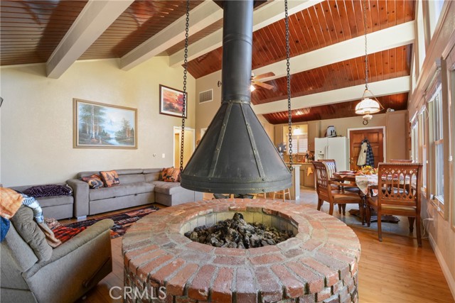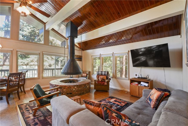This well-kept 2-bedroom, 1-bath cabin offers a perfect escape into the San Bernardino mountains. Built in 1978 and full of character, the home features vaulted high ceilings, a unique indoor fire pit, and a spacious open living area that creates a warm, inviting atmosphere year-round. Situated on a generous 7,000 sq ft lot, the home includes an outdoor deck ideal for relaxing or entertaining in a peaceful wooded setting. Whether you’re looking for a weekend getaway, vacation rental, or full-time mountain living, this property fits the bill. Located just 30 minutes from the city, you'll enjoy the rare combination of quiet mountain living with convenient access to urban amenities. Close to hiking trails, ski resorts, and Lake Arrowhead, this cabin is your gateway to year-round recreation.