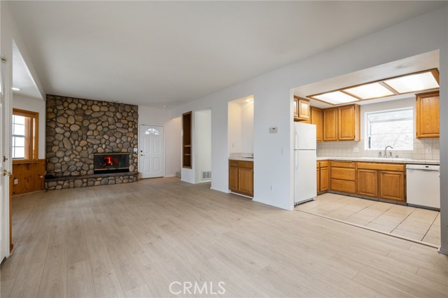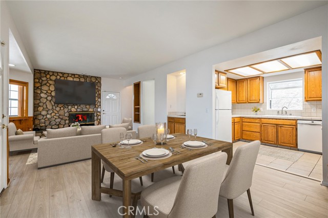 Purchase this home with a 0% downpayment USDA loan! Escape to your own stylish mountain retreat, where serenity meets convenience. Nestled in a picturesque location with easy commuter access, this home is the ultimate peaceful getaway. The inviting main level open floorplan features a spacious living room, highlighted by a stunning classic rock fireplace and a wet bar—perfect for cozy evenings or entertaining guests. Adjacent is a bright dining area that flows into the charming kitchen, offering an ideal space for meals and memories. Upstairs, you'll find two generously sized bedrooms and a full bath, plus a primary suite with exclusive access to the bathroom for added privacy. A well-placed laundry closet in the hall adds to the home's functionality. Freshly painted throughout with brand-new flooring, this home exudes a sense of newness and comfort. Step outside and enjoy two expansive decks, surrounded by towering trees - the perfect spot to unwind. A peek of the valley view adds a touch of magic to this peaceful retreat. Plus, ample storage space beneath the main deck makes this home as practical as it is beautiful. Don’t miss your chance to own this mountain sanctuary, where every day feels like a holiday!