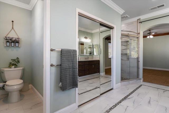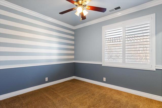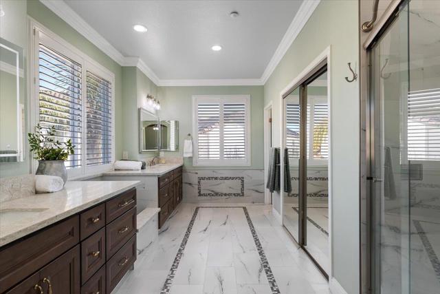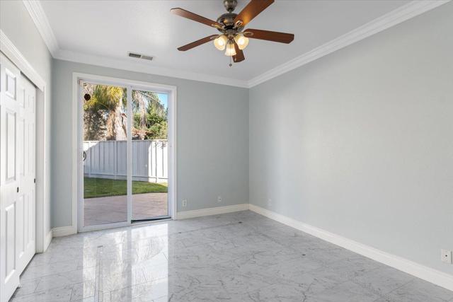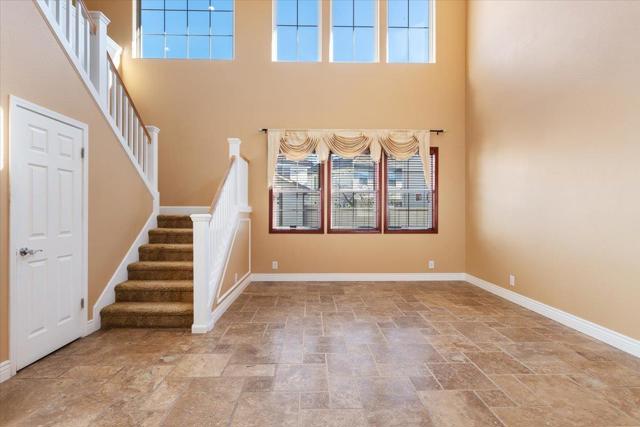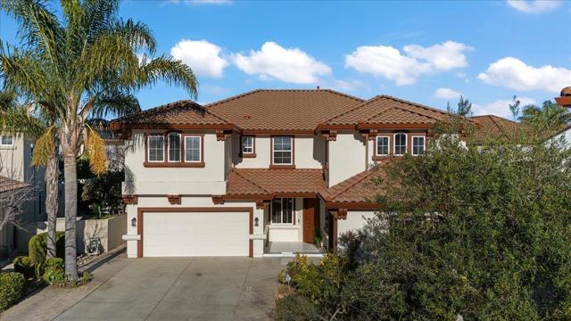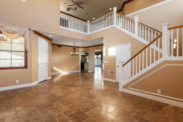 Welcome to this exceptional 6-bedroom, 3-bath residence, showcasing superior craftsmanship and extensive upgrades throughout. Designed with elegance and functionality in mind, this home features crown molding, travertine tile, wood floors and carpeting, blending timeless design with modern comfort. At the heart of the home is a spacious, open-concept kitchen, perfectly suited for both everyday living and refined entertaining. Flow effortlessly into the family and dining areas, where natural light fills the space to create a warm, inviting atmosphere. A bedroom conveniently located downstairs offers flexibility for guests, extended family, or a private office ideal for todays lifestyle needs. Step outside to a large, beautifully landscaped backyard featuring grass and elegant stamped-cement patios perfect for relaxing, entertaining, or hosting gatherings in style. Nestled on a quiet cul-de-sac, this home offers peace, privacy, and prestige, while remaining close to shopping centers, restaurants, and freeway access. The tile roof and stunning elevation enhance its curb appeal, reflecting the timeless quality of its design. Built by the highly respected Herod Homes, this is one of the largest and most desirable models in the community.