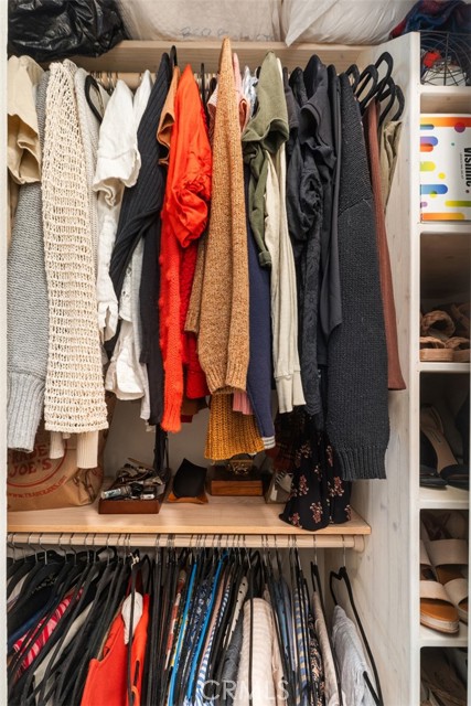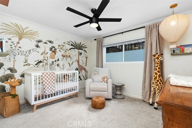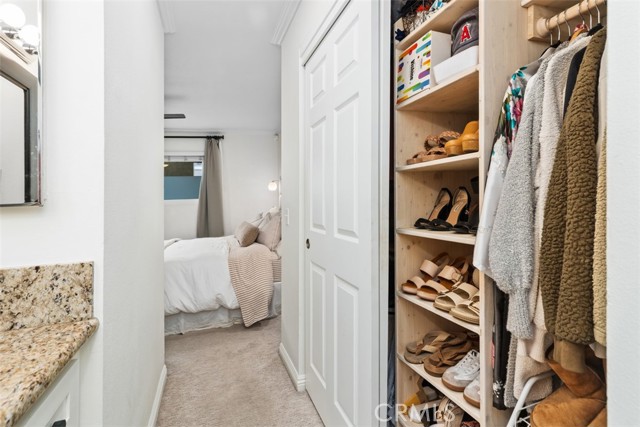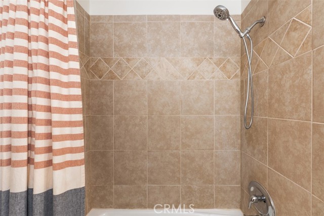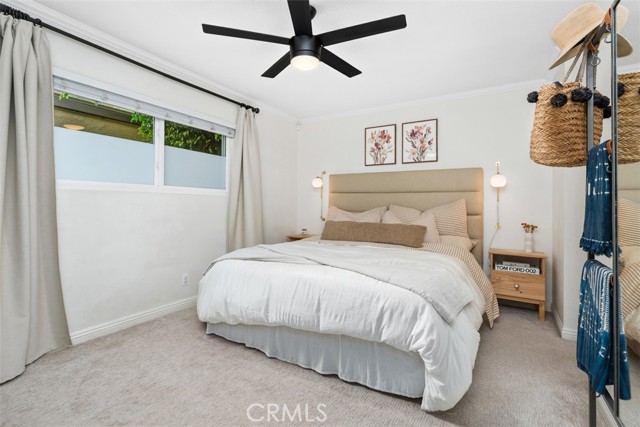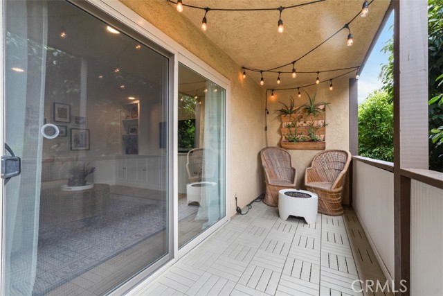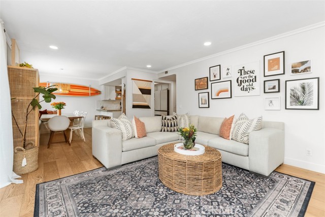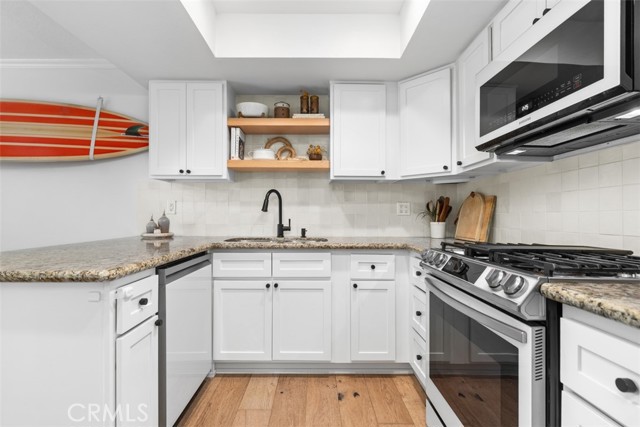 214 Via Robina #5 presents a stylishly renovated condo in the hills of San Clemente with inviting indoor spaces and relaxing views from the upgraded floating floor deck. Two bedrooms, two bathrooms and one car garage located on large cul-de-sac. The showpiece kitchen features modern Shaker cabinetry with CB2 matte black hardware, a handmade Zellige Moroccan tile backsplash with tight grout lines for sheer beauty, and granite countertops with a deep double sink. A suite of Samsung Bespoke matte black appliances, accented with white glass fronts, includes a five-burner gas range with oven, coordinating refrigerator, microwave and dishwasher. A raised ceiling with recessed lighting and an adjacent built-in banquette with custom cushions create a warm, functional dining space ideal for gatherings of up to 10–12. Both bathrooms have been elevated with designer mirrors, the primary featuring timeless marble flooring and the hall bathroom showcasing large-format porcelain floors and custom shelving. Throughout the home, brushed European oak engineered wood floors, finished with polyurethane for durability and beauty, add richness. Additional details include 4-inch crown molding, six-panel doors, and textured cut-pile carpet in the bedrooms. Each bedroom also offers a matte black ceiling fan for style and comfort. Other highlights include a central heater (installed 2016), dual-pane windows, custom built-in Shaker-style entertainment cabinetry in the living room, and a full-size stacked washer/dryer. For leasure enjoy the HOA common area garden for residents and common area patio with coastal and ocean views! This thoughtfully upgraded residence combines craftsmanship, comfort, and design — all within minutes of San Clemente’s beaches, shops, and restaurants.