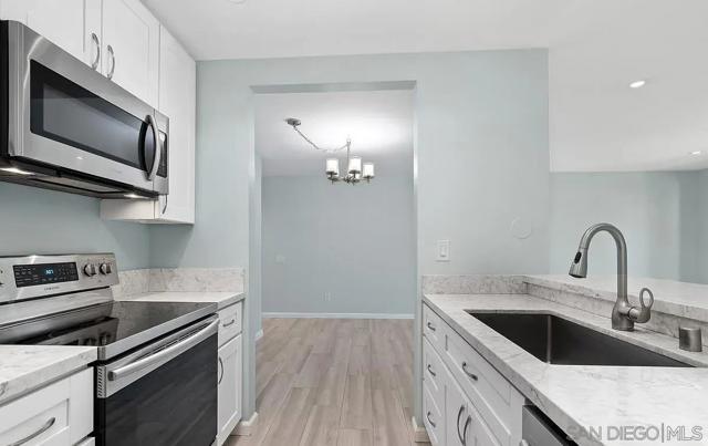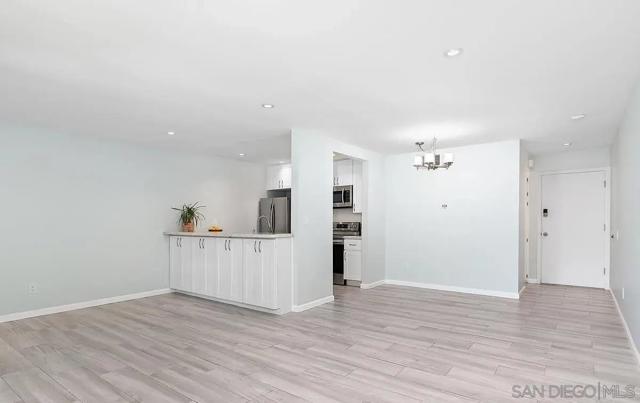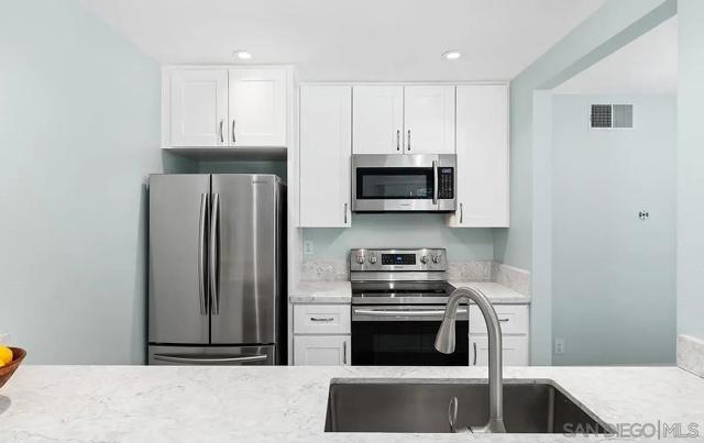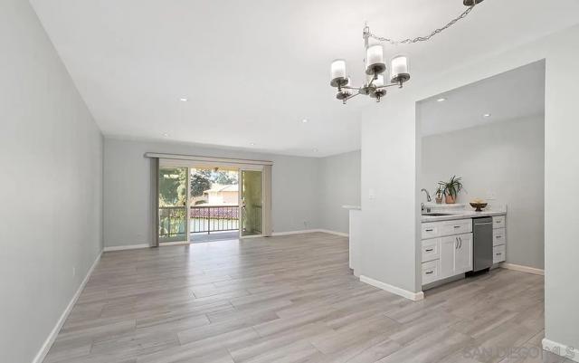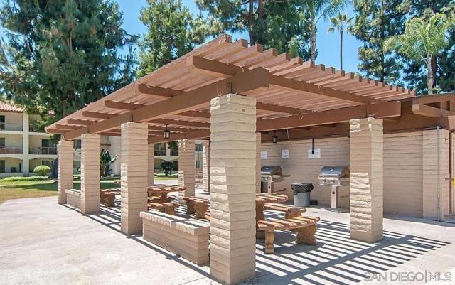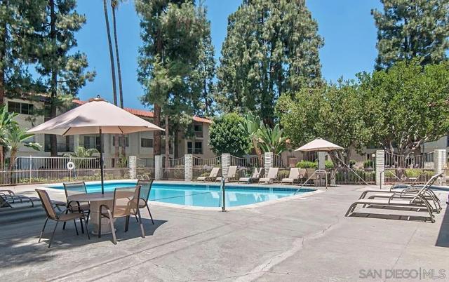 Remodeled south facing top floor condominium located in San Diego's vibrant Mission Valley. Peaceful greenbelt view. Bright & airy. Covered balcony with storage closet. Covered parking plus 2 additional unassigned parking spaces. Open floor plan. White shaker cabinets. Quartz counter tops. Stainless steel appliances. Modern plank flooring. Dual pane thermal window and sliding glass door. Recessed lighting. Remodeled bathroom with walk-in shower. Primary bedroom with ceiling fan and mirrored sliding closet doors. Central A/C. Park-like grounds with 3 pools, 2 spas, sauna, gym, BBQ area, dog park, pickleball, tennis, volleyball and basketball courts.