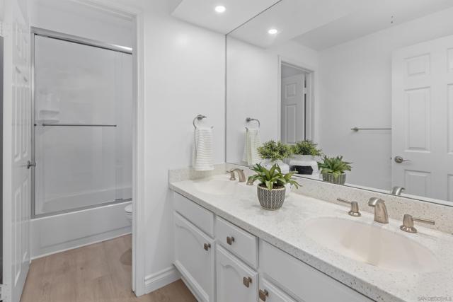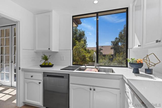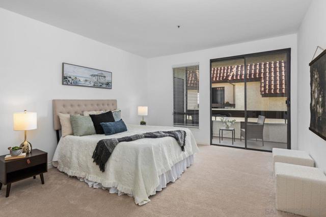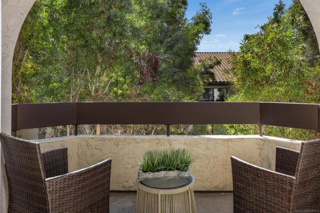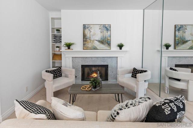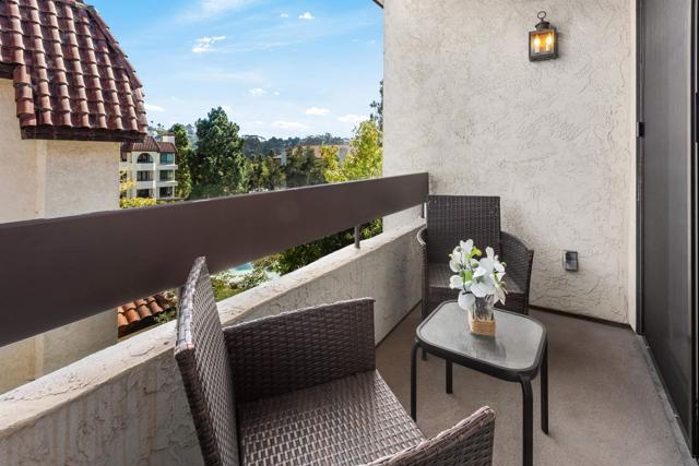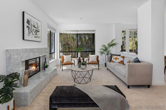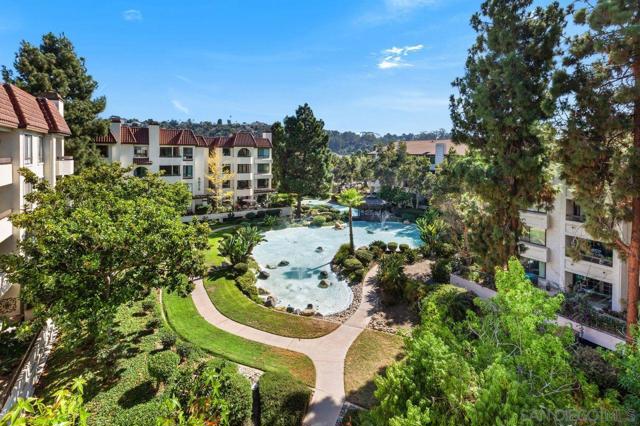 This truly is penthouse-style living! Come to see the largest and most sought-after floorplan at The Courtyards– the Rothschild. This beautifully remodeled 3-bedroom, 2-bath top-floor corner unit offers an impressive 1,969 sq ft of light-filled, turnkey living space with breathtaking views of the mountains, tranquil pond, and lush walking pathways. Step inside to discover this gorgeous remodel with brand-new flooring, fresh paint, upgraded lighting and elegant touches throughout. The remodeled kitchen features elegant stone countertops, a new farmhouse sink, stainless steel appliances, and a bright breakfast nook – perfect for casual dining. Both bathrooms have been tastefully remodeled with stone counters, white cabinetry, luxury vinyl plank flooring, and updated lighting and fixtures. The spacious primary suite is a true retreat, complete with a cozy sitting area with built-ins and a beautiful fireplace, plus a private balcony. The luxurious en-suite bathroom includes dual walk-in closets and ample space for comfort and functionality. Enjoy three balconies that take full advantage of the scenic surroundings, ideal for morning coffee or evening relaxation. The unit has two side-by-side parking spots, conveniently located near the elevators in the secure underground parking. Inside laundry with stackable unit that conveys. The Courtyards is a prestigious gated community offering resort-style amenities including pools, spa, tennis courts, exercise room, library, meeting room, and lush green areas throughout. All of this just minutes from Fashion Valley, the YMCA, public transportation, fine dining, and upscale shopping. This is a rare opportunity to own a top-floor Rothschild unit in pristine, move-in ready condition. Don’t miss your chance!