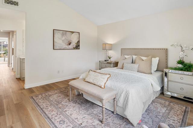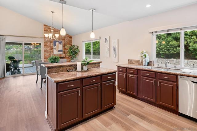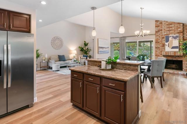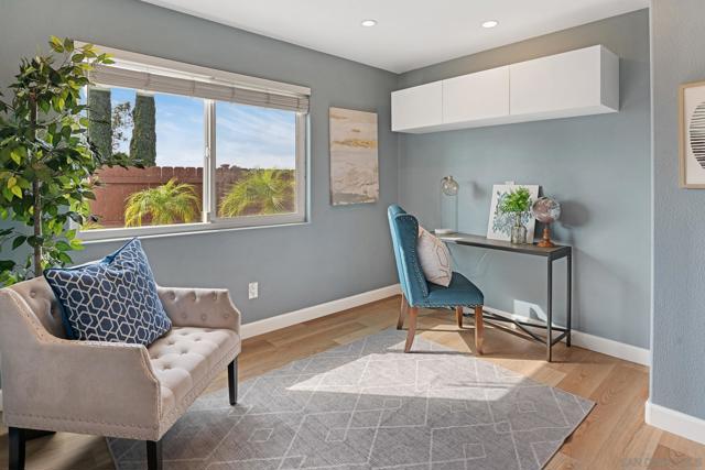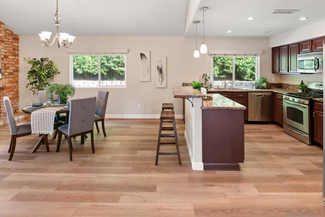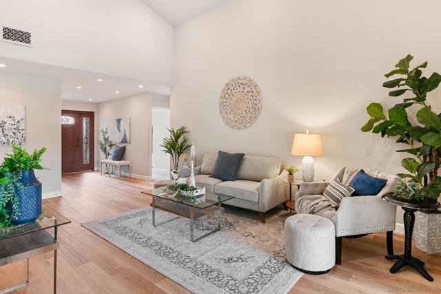 Light and bright, open-concept home featuring vaulted ceilings in the living space and brand-new luxury vinyl plank flooring throughout. An open kitchen features granite counters, stainless steel appliances, an island, and overlooks the dining area. The primary suite offers a walk-in closet and a beautifully designed bathroom. The third bedroom has been converted into a functional home office, and the stylishly remodeled second bath adds a modern touch. Enjoy entertaining in the spacious backyard with a covered patio and grassy area overlooking open space. The property backs up to Margerum Park and provides easy access to local hiking trails and Mission Trails Regional Park. Located within the highly rated Marvin Elementary, Lewis Middle, and Patrick Henry High School boundaries. A great value and a true must-see!