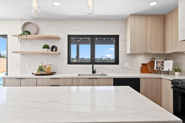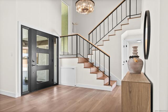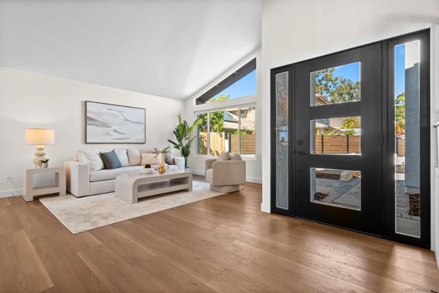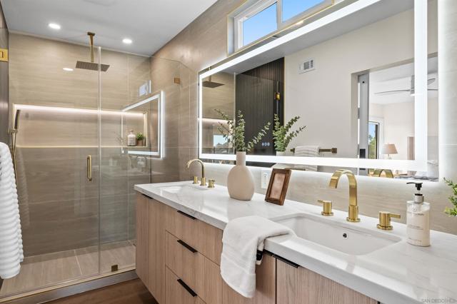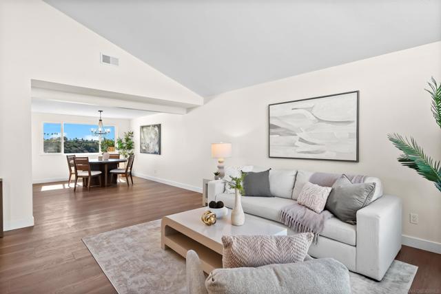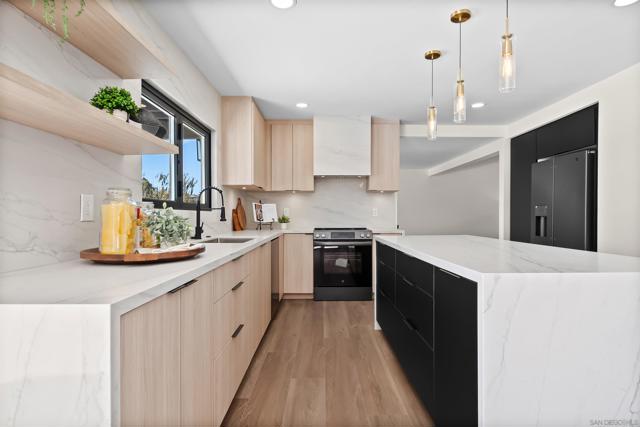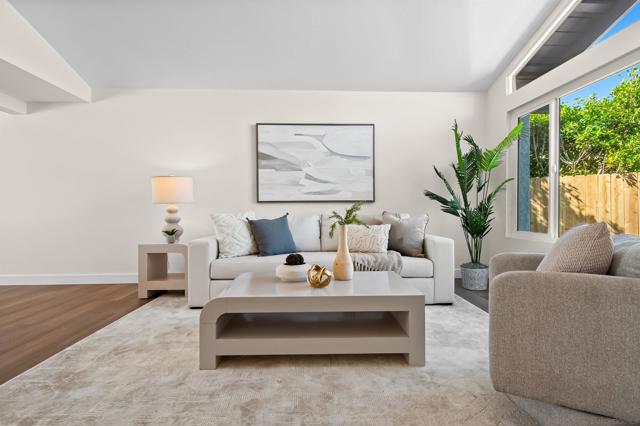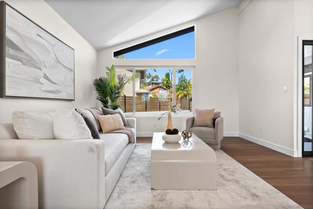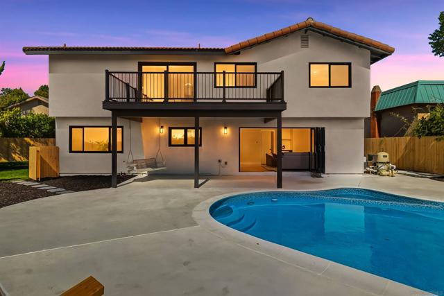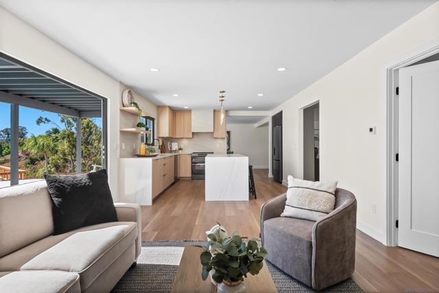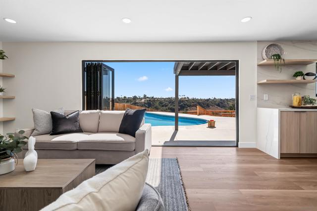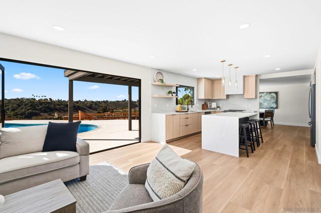 Experience modern coastal living in this fully remodeled five-bedroom, three-and-a-half-bath home in highly desirable University City. Set on a 9,100 sq. ft. lot, this residence features vaulted ceilings, abundant natural light, and a gourmet kitchen with waterfall-edge quartz counters, custom oak cabinetry, and a large island. Enjoy seamless indoor-outdoor living with 12-foot cantina doors opening to a landscaped backyard with west-facing canyon views, a refinished pool, and multiple decks—including a private deck off the primary suite. Flexible layout offers dual primary suites, designer bathrooms, and wide-plank luxury vinyl flooring throughout. Additional highlights include a three-car garage and a quiet cul-de-sac location near top schools, beaches, parks, shopping, and dining.