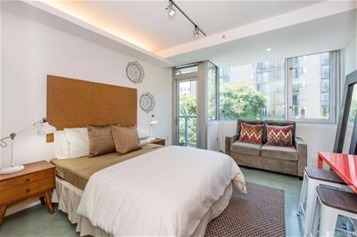 Rarely available, imaginative and stylish studio condominium at the Cubix with balcony! This light, bright unit boasts sleek, polished concrete floors with radiant heat, modern kitchen w/ stainless steel appliances, and spacious full bath w/ frosted glass door. Located on the backside of the building and is extremely quiet with green and city outlooks, including a front row view of salesforce tower! Efficient use of space allows for not only a queen bed and love seat, but also a desk/dining room table with room to spare. This gorgeous unit is complete with a large, deeded storage locker for additional storage/bikes. Amazing common roof deck and A+ location with Walk score 94, Bike score 94, Transit score 100.