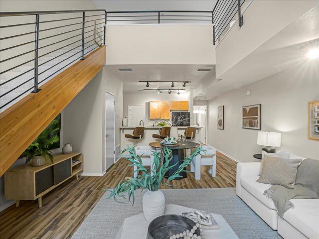 Welcome into the ultimate expression of modern urban living - an effortlessly chic loft retreat just moments from the heart of Downtown San Jose! This stylish loft-style condo offers 1,113 sq. ft. of thoughtfully designed living space, featuring soaring ceilings, a sleek industrial vibe, and a layout perfect for both relaxing and entertaining. Step into a bright and airy open-concept living area where gatherings of any size feel right at home. The kitchen is equipped with granite countertops, a built-in dishwasher, and an oven range ideal for everything from casual meals to dinner parties. Just off the living room, a private patio invites you to enjoy your morning coffee or unwind under the stars. Upstairs, you'll find a spacious bedroom loft and a full bathroom includes a tub and a shower, while a convenient half-bath is located on the first floor. Enjoy the perks of two dedicated parking spots, extra storage, and fantastic community amenities including an in-ground pool, hot tub, fitness center, club room for hosting, EV charging stations, guest parking and BBQ area. San Jose implemented a partial quiet zone where train horns are restricted between 10 PM and 7 AM. Dont miss your chance to call this stunning loft your new home!