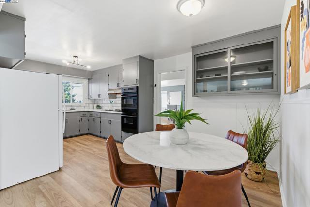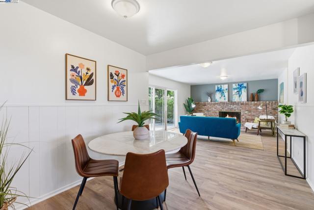 Single level Bay-O-Vista classic with fresh style and easy indoor outdoor flow. This light-filled 3 bedroom, 2.5 bath home welcomes you with an oversized picture window and a stone fireplace in the living room. The adjoining family room with brick fireplace opens to a sunny patio that makes entertaining simple. The newly updated kitchen balances, modern luxury with classic charm. Showcasing design forward color choices on the cabinetry, modern subway tile, quartz countertops, and a cozy breakfast nook. Recent updates include interior and exterior paint, updated lighting, updated kitchen, and bathroom, wide-plank floors that deliver a modern, move-in-ready feel. The hall bath features a new double vanity with matte black fixtures and new flooring. Important system work has been completed, including rear foundation and drainage upgrades for long-term peace of mind, plus a newer roof. The low-maintenance yard offers multiple seating areas, terraced plantings, and hillside outlooks. A two-car garage and a wide driveway provide easy parking. Minutes to Lake Chabot trails, local shops and dining. A bright, comfortable home in a coveted neighborhood with room to personalize over time.