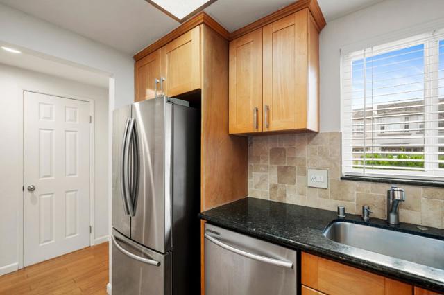 Tastefully updated and move-in ready, this spacious 2-bedroom, 2-bathroom condo offers over 1,100 sqft of comfortable living in a desirable San Leandro neighborhood. The home features beautiful bamboo flooring on the main level, recessed lighting, and a modern kitchen equipped with stainless steel appliances, updated cabinetry, and a striking stone backsplash. Both bathrooms showcase the same refined stone backsplash, adding a cohesive and upscale touch. Enjoy the added convenience of a detached garage, in-unit laundry, and a prime location near BART, shopping, and dinning blending style, comfort, and accessibility in one exceptional offering.