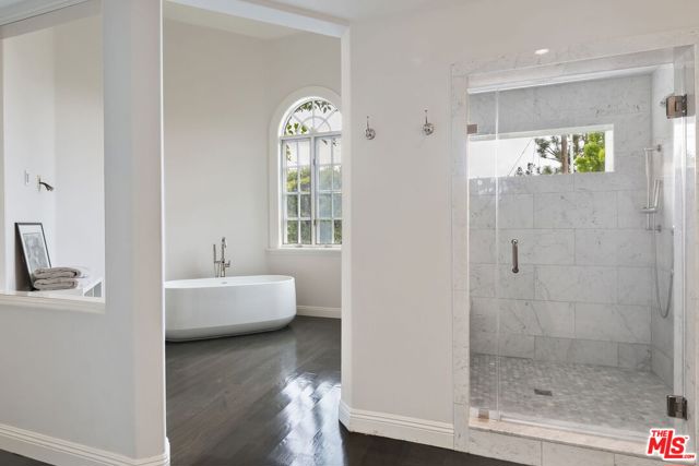 Elegant 2-story Mediterranean in the coveted North of Montana neighborhood of Santa Monica. Situated on a tree-lined street, this updated home features generous open living spaces with custom details throughout. Upstairs are 4 well-proportioned bedroom suites, including the luxurious primary suite with two generous walk-in closets, sitting area, fireplace, balcony, and spa-like bath. Chef's kitchen with center island and breakfast area opens to the family room. Well landscaped backyard is enhanced with nature trees, covered patio, a new pool, spa, and outdoor dining/ entertaining area. The updated home includes hardwood floors, new appliances, stone counters, and custom finishes.
