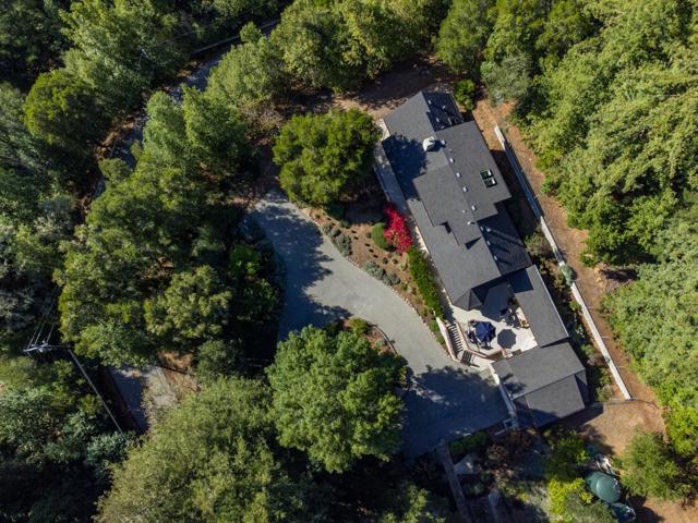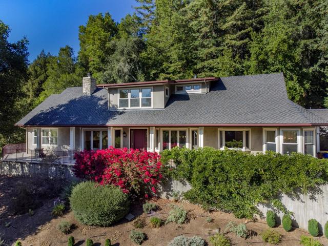 Welcome to this remarkable custom built 3-bedroom, 2.5-bathroom mountain estate just minutes from city of Scotts Valley and Hwy 17. With 2,583 square feet of living space, this residence offers a spacious and inviting atmosphere. It has 10 ft ceilings, a staircase with skylights and clerestory windows, French doors & tall windows bring in light and the beauty of nature. The kitchen is a chef's delight, featuring granite countertops, tile backsplash, a Viking range, and a suite of modern appliances. Enjoy casual meals in the breakfast room or host elegant dinners in the formal dining room. The home boasts a variety of flooring options, including carpet, hardwood, and tile, ensuring comfort and style. Added amenities include security gate, fire sprinklers, the mature landscaping is drought tolerant, on-demand hot water heater & outside security lights. The spacious patio is great for outdoor entertaining. Separate bonus room over the large two car garage could be office, gym, or art studio. The laundry room has washer/dryer and custom storage cabinets. Situated on 13+ acres which includes a portion of the historic stagecoach line from Los Gatos to Santa Cruz. A must see!