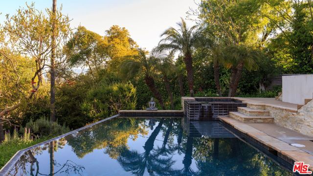Welcome home to your own private Architectural Oasis in Prime Sherman Oaks. Situated just South of the boulevard, this Architectural Oasis is tucked behind gates and perched above the street on a rare double lot. This exceptional Sherman Oaks retreat offers the perfect balance of refined design and serene outdoor living. Designed by notable architect Dennis McGuire, known for seamlessly integrating structures with their surroundings, the home reflects a quiet elegance and intentional connection to nature. Formerly part of a botanical garden, the grounds are lush and layered, with mature trees: an 80-year-old Melaleuca tree, palm trees and fig trees as well as a Meyer lemon tree. All are centered around a breathtaking saltwater pool, spa, and three cascading waterfalls that serve as a tranquil centerpiece, surrounded by curated outdoor living and entertaining spaces. Back inside the kitchen is the heart of the home, with expansive ceiling heights and natural light throughout. The kitchen is outfitted with Caesarstone countertops, a 6-element Dacor cooktop, Fisher & Paykel refrigerator, convection oven, Bosch dishwasher, and built-in wine fridge perfectly blending form and function. Adjacent you'll find the private outdoor patio with European-style outdoor fireplace and BBQ, remote-controlled patio awning, and built-in Bose sound system. Solar panels are paid off and for convenience there is a Tesla charger located in the garage. Every element of the home has been carefully curated for comfort, sophistication, and connection to the surrounding environment. There are multiple levels that create private living spaces and bedrooms. All with privacy and comfort and updated details. Throughout the house the natural light and 50 windows facilitate in capturing the essence of California living; effortless, and completely private. Welcome to a new elevated way of living.