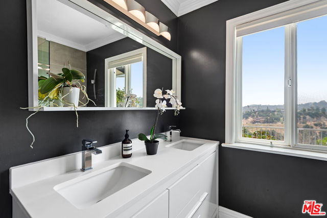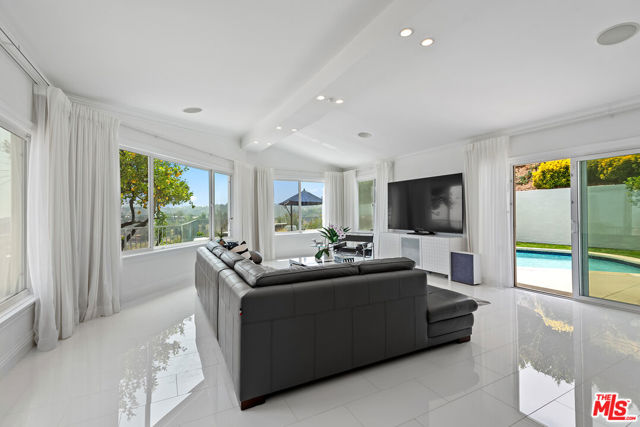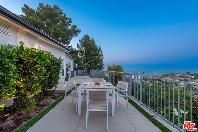 Captivating entertainer's home with unobstructed 180-degree views of the Valley, canyons, and mountains from nearly every room. Nestled south of the Boulevard in the prestigious Skyview Estates-on one of Sherman Oaks' most sought-after cul-de-sac streets-this exceptional residence is set on an expansive and ultra-private 17,895 square foot lot. Meticulously remodeled from top to bottom, the home offers 3 bedrooms and 2 bathrooms across 2,774 square feet of refined living space. Step into the elegant main living area, where soaring ceilings and abundant natural light create an airy, inviting ambiance. A sleek, gray modern fireplace acts as a stunning focal point between the living and family rooms. The spacious family room features an entire wall of glass windows showcasing breathtaking views. The chef's kitchen is a culinary delight, equipped with striking white cabinetry, top-of-the-line stainless steel appliances, a contemporary backsplash, and a stylish eat-in bar that opens to the dining space. The oversized dining room boasts a wall of sliding glass doors, opening directly to the backyard for the ultimate indoor-outdoor lifestyle. Retreat to the luxurious primary suite-a serene oasis with gorgeous views, a generous walk-in closet, and a luxurious bath complete with a freestanding tub, oversized glass shower, towel warmer, and two separate vanities. The sprawling backyard is an entertainer's paradise, featuring a sparkling pool and spa, an expansive deck overlooking the magical vistas, and wraparound outdoor space ideal for al fresco dining, lounging, and entertaining. A lower terraced level offers an abundance of fruit trees and a garden bed. Additional highlights include two well appointed guest bedrooms, a gym space, endless windows and natural light, two gated parking spaces, and countless thoughtful upgrades. Privately tucked away yet centrally located, this one-of-a-kind home offers easy access to both the Valley and the Westside and is just a stone's throw from Bel Air, Brentwood, and Beverly Hills.