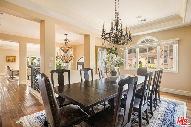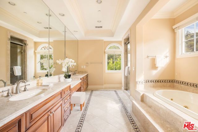 Tucked away within the prestigious enclave of "The Benedict Collection" at the southern tip of Sherman Oaks, this rare estate is one of only seven residences at the end of a tranquil cul-de-sac. Offering sweeping vistas of the San Fernando Valley and beyond, the home embodies timeless sophistication while celebrating the ease of indoor-outdoor California living. The light-filled living room, anchored by a stately fireplace, flows effortlessly to a serene outdoor terrace with captivating city, mountain and lush green views. An adjacent family room and dining room extend into the expansive kitchen and breakfast area, oriented toward the rear terrace and grassy yard ---complete with ample space for a pool. The primary suite features a fireplace and generous bathroom, and connects to a versatile secondary bedroom ideal as a private office, retreat or gym. The lower level is designed for both comfort and versatility, with four additional bedrooms, a spacious open lounge or play area, and a conveniently located laundry room. Direct access to the 4-car garage completes the thoughtful layout. Blending privacy, elegance and views in a beautiful setting, this exceptional residence offers an unrivaled opportunity to own one of Sherman Oaks' most coveted addresses.
