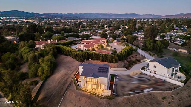 YOU MUST SEE THIS BRAND NEW CONSTRUCTION, built by Mohammad Moalej. Absolutely stunning estate located in West Simi Valley, presents a rare opportunity to own a modern 5-bedroom, 5.5-bath estate on a private gated lot with sweeping views of Mount McCoy and the Sinaloa Golf Course. With 4,500 square feet of living space and situated on a 20,563 square foot lot, this home is designed with a blend of contemporary architecture and thoughtful functionality. A shared private driveway leads to custom iron and glass double doors that open into a light-filled interior with soaring ceilings, engineered wide plank white oak flooring, and Milgard windows and doors throughout. The main level includes an inviting living room with fireplace, built-in bar with wine fridge, and hillside views. The open-concept kitchen features stainless steel KitchenAid appliance suite, quartz countertops, custom cabinetry with glass accents, elegant backsplash and gold accent hardware and pot filler. The oversized walk-in pantry will fit all of your necessities and more! The adjoining family room includes surround sound and large sliding doors that extend the living space onto a rear patio ideal for morning coffee or sunset views. The downstairs also includes a spacious guest bedroom with ensuite bath and custom closet organizers with golf course views, along with a powder room and cozy sitting nook. Upstairs, a central loft area separates the bedrooms for privacy. The expansive primary suite sits at the back of the home, showcasing panoramic views, a private balcony, a luxurious bath with marble flooring, oversized walk-in shower, soaking tub, dual vanities with custom hardware, a walk-in closet with custom organizers which is large enough to accommodate a jewelry/accessory island. Three additional upstairs bedrooms each feature ensuite baths. Two of the guest rooms are Junior primary guest suites, offering walk-in closets with custom organizers, en-suite full bathrooms with porcelain tile finishes, and lovely views. Convenient upstairs laundry room with additional storage. The home includes a 12-panel owned solar system, dual 5-ton HVAC units, tankless water heater, Cat 5/6 wiring, fire sprinklers, a finished two-car garage, new landscaping, and vinyl fencing. Every detail of this home was carefully curated to offer style, comfort, and high-end living in a private West Simi Valley setting. There is nothing else on the market like this fantastic property!