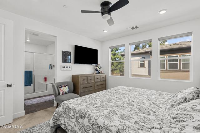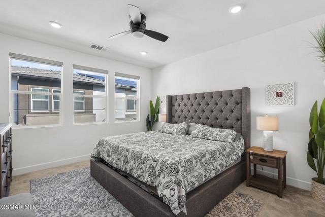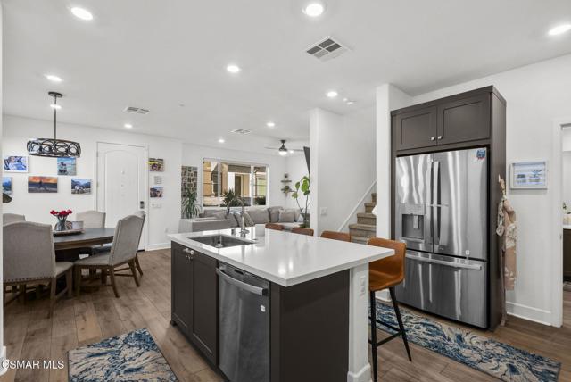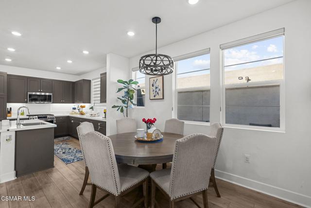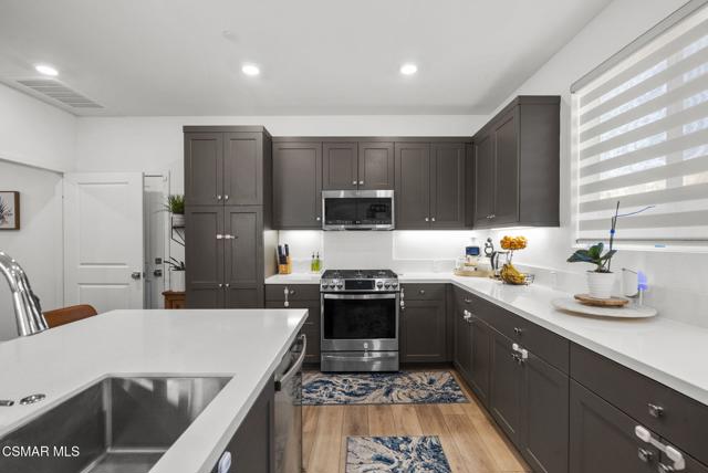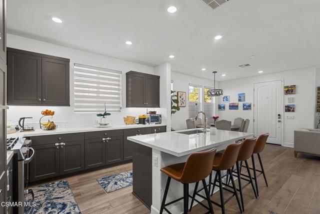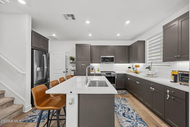 Welcome to 2579 Little Rock Ln, a beautifully appointed 4-bedroom, 3.5-bathroom in the heart of Central Simi Valley offering approx. 1819 sq. ft. living space. This newer build at Sycamore Grove, is a modern Mediterranean resort style community that includes many smart home technologies. The chef's kitchen features an oversized island, pristine quartz countertops, stainless steel appliances, a 5 burner gas cooktop, pantry with pull out shelving, a ton of cabinet space, and a deep single-bin sink. The openness to the family area flows seamlessly making it perfect for large gatherings. The whole home is flooded with natural light and each window is adorned with beautiful custom blinds. Upstairs features a luxurious primary suite with a large walk-in closet, over sized shower and gorgeous quartz counters. The 3 additional bedrooms generously sized, with one featuring a full attached bathroom. The home boasts these smart home technology features: Rinnai tankless water heater, Moen-Flo smart monitor for water leaks & water usage, ring door bell & alarm, solar panels, smart Honeywell thermostat, and a charging adaptor/plug that is compatible with Tesla charger. This unit is an end unit, so only 1 neighbor on one side. It has a front AND SIDE PATIO area and does not back up to an open parking lot. There are only 8 units that have this additional side patio area. This resort style community offers exclusive amenities such as a swimming pool area with BBQ's, fire pit, cabanas, and luscious seating. There is also a community garden, additional BBQ area, park area, another fire pit area with bocce court for hours of entertaining guests. Conveniently located to easy freeway access, many restaurants, shopping, grocery stores, banks, Starbucks and fitness centers. The Sycamore Groves community offers both luxury upgrades, with everyday practical living.
