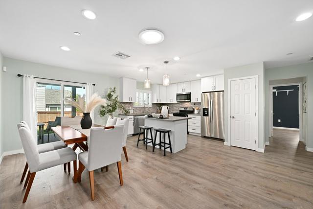 Beautiful newer construction, built in 2021, this home boasts a spacious open floor plan with wood laminate flooring throughout and elegant plantation shutters. Each bedroom is thoughtfully located in its own corner of the home, ensuring maximum privacy. Modern comforts include central heating and A/C, plus an attached 2-car garage with storage cabinets, a ceiling shelf, and electric car charging capabilities. The beautifully appointed kitchen showcases crisp white shaker-style cabinetry, a custom tile backsplash, quartz countertops, stainless steel appliances, and an island with breakfast counter seating. The spacious primary suite offers exterior patio access, ample closet space, and a private en-suite bathroom. The low-maintenance backyard features turf, stamped concrete, and a covered patio—perfect for outdoor entertaining—along with a storage shed for extra convenience. Additional highlights include RV parking and easy-care landscaping, combining functionality with style.