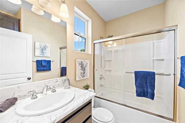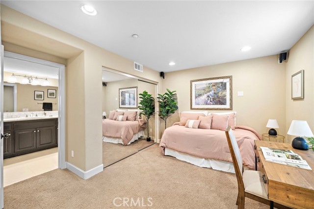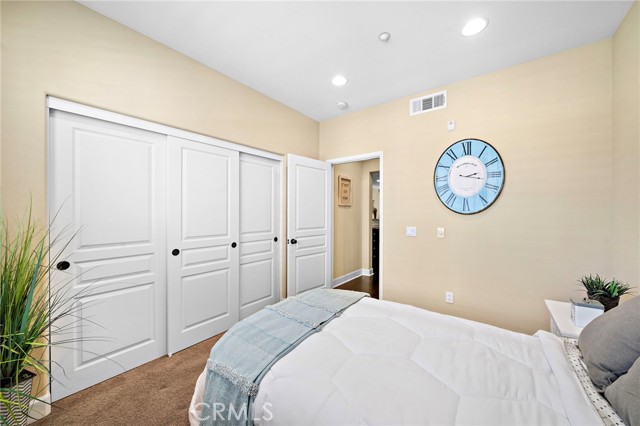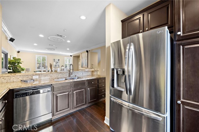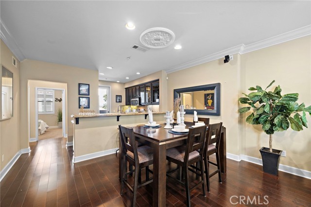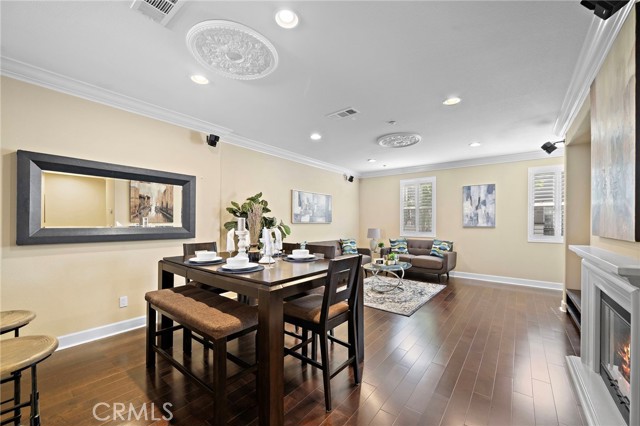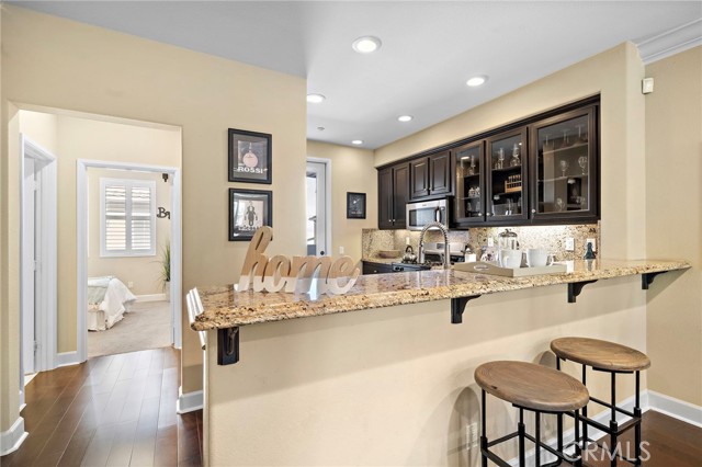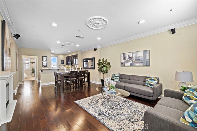 Absolutely stunning tri-level townhome-style condo quality-built by Taylor Woodrow in 2007, nestled in the exclusive Palazzo community within Renaissance Plaza with resort-style association pool, spa, and beautifully landscaped grounds, this contemporary beauty boasts 4 bedrooms, 4 full bathrooms, and 1,814 square feet and has been beautifully upgraded with modern luxury finishes throughout including central A/C, volume ceilings, crown molding, dual pane windows, plantation shutters, clear-glass French doors, raised panel interior doors and closet doors, LED recessed lighting, wide-plank wood laminate flooring, and full surround-sound wiring; the remodeled chef’s dream kitchen is a masterpiece with granite countertops, full granite backsplash, rich dark-wood soft-closing cabinetry with glass display panels and under-cabinet lighting, stainless double sinks, and stainless appliances including a gas range, dishwasher, and microwave, plus a breakfast bar open to the elegant living room with fireplace, media niche, and dining area, with a French door leading to a private second-level patio perfect for evening barbeques and dining; the bathrooms showcase Carrera marble-look countertops, upgraded lighting, tile finishes, and clear-glass enclosures, with dual sinks in the primary suite, while an ensuite bedroom on the first floor, inside laundry room, and direct-access 2-car garage plus an additional guest parking provide comfort and convenience; ideally located in the vibrant heart of Stanton, close to shopping, dining, parks, and schools with quick access to the 5, 22, and 91 freeways, offering the perfect combination of modern living, convenience, and effortless accessibility.