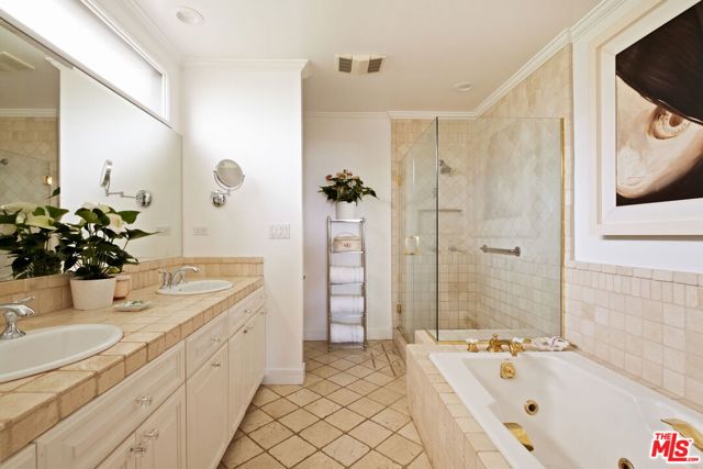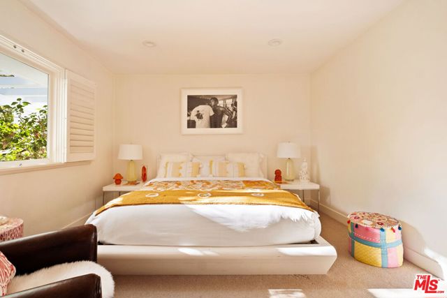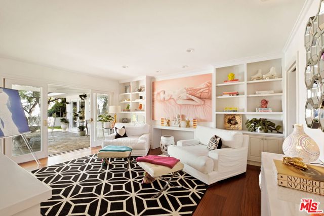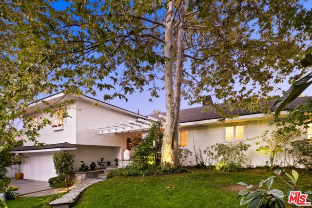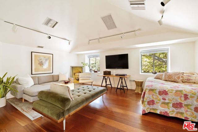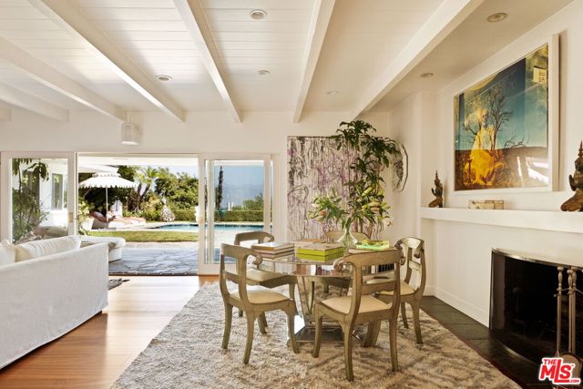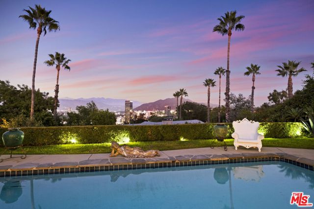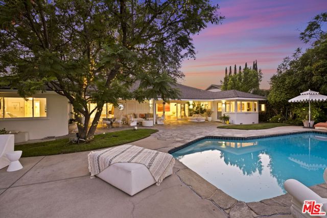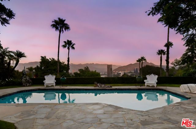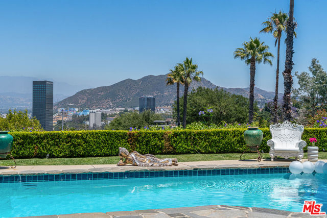 Tucked away on a rare, flat 11,000 SF lot in the Hollywood Hills, this expansive mid-century ranch radiates joy and calm in equal measure. The moment you pass through the privacy hedges and step inside the cheerful orange front door, the home's warm energy is unmistakable. At the heart of the home, a generous great room is anchored by a classic brick fireplace on one side, custom built-ins on the other, and sliding glass doors in the center that frame sweeping views of the hills, mountains, and Universal City. Just beyond, the large flat backyard with sparkling pool becomes a natural extension of the living space, inviting seamless indoor-outdoor living. The sunlit kitchen is equally inspiring, with crisp white cabinetry, Caesarstone counters, and a built-in banquette framed by bay windows that perfectly capture the view. A spacious laundry room and full bath sit conveniently adjacent. On the opposite wing, a large den with French doors opening to the backyard leads to three bedrooms, including two that share a Jack-and-Jill bath and the primary suite. The primary retreat is a sanctuary unto itself, with a custom walk-in closet, ensuite bath with dual sinks, soaking tub, and separate shower, plus French doors that open directly to the pool and garden. Above the converted garage discover a flexible fourth bedroom, once a recording studio, ideal as a creative workspace, private guest suite, or the perfect hideaway for a teenager in need of their own world. The backyard is nothing short of show-stopping: lush landscaping, a stone-flanked pool, and generous flat grassy areas offer endless opportunities to lounge, play, and entertain, all with dazzling views as your backdrop. With its rare combination of a thoughtful floor plan, expansive flat lot, serene views, and a central location, this home offers not just a place to live, but a place to truly exhale.
