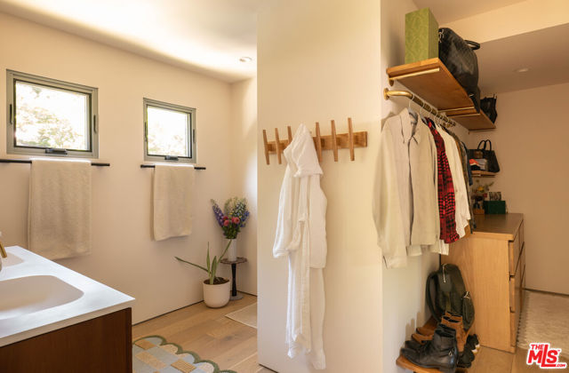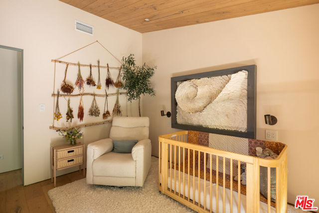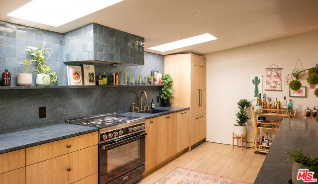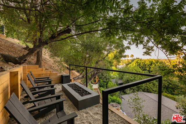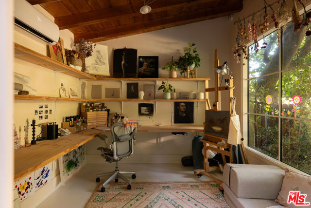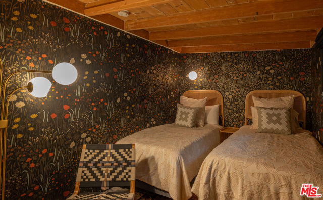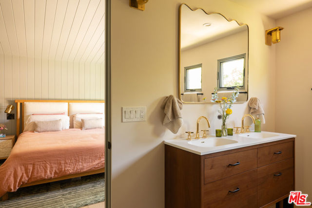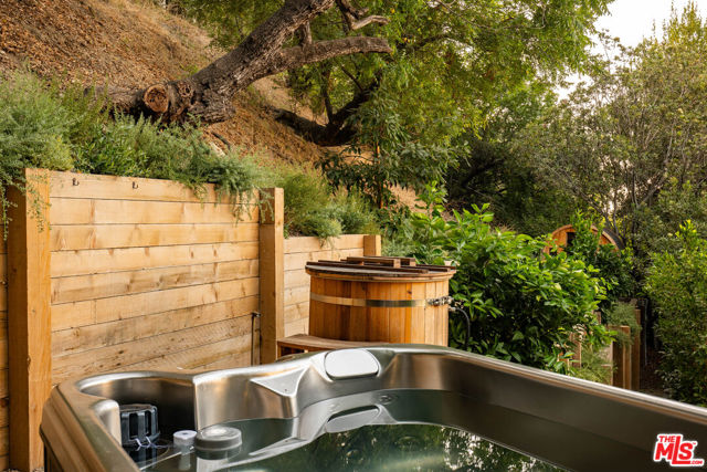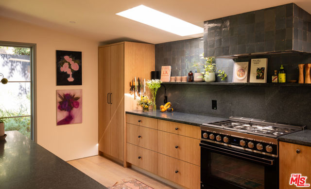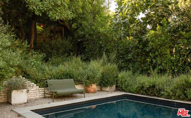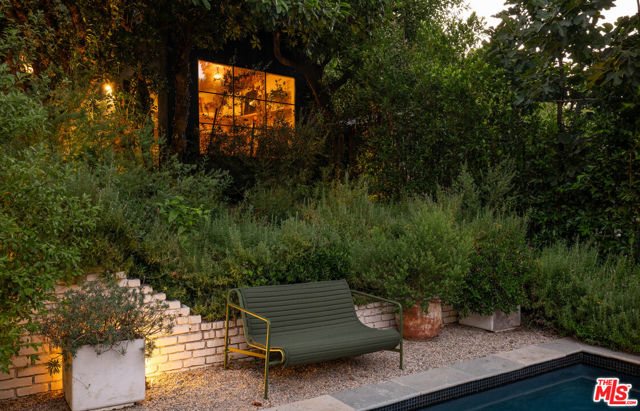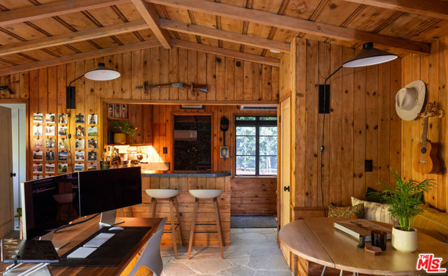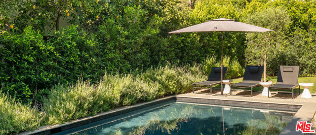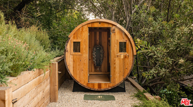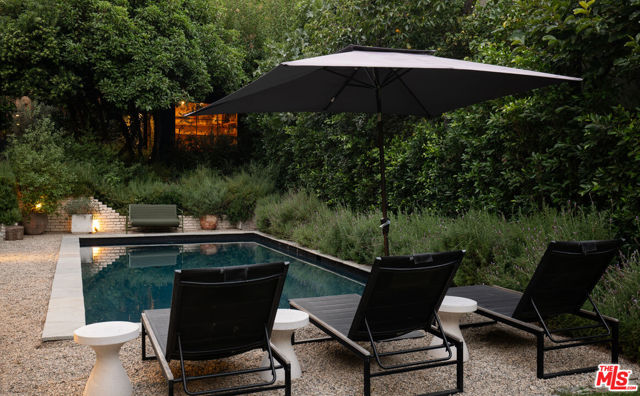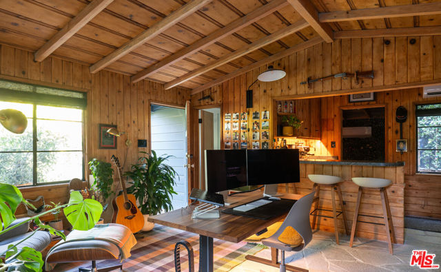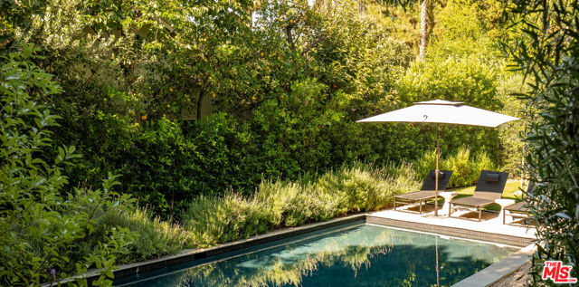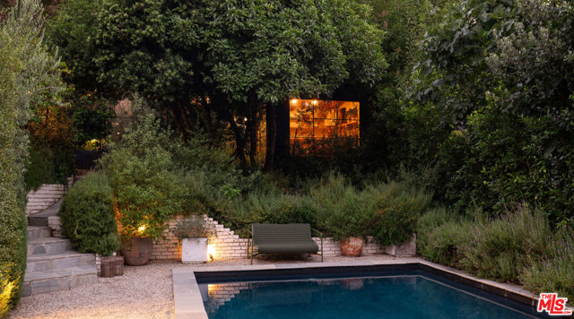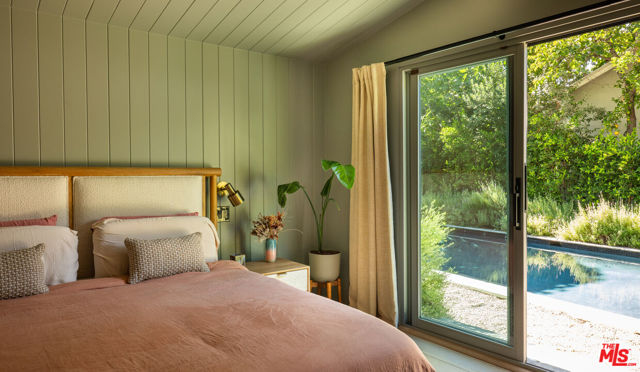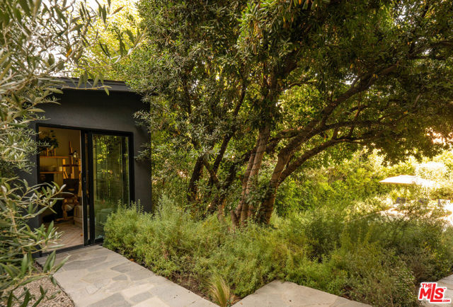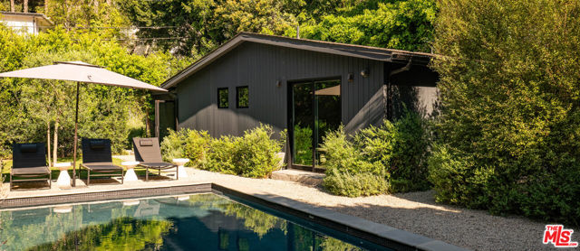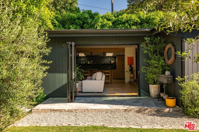 Nestled behind lush hedges and mature trees, this exquisite single-level retreat offers unmatched privacy and seamless indoor-outdoor living. Located South of the boulevard in prime Studio City, this thoughtfully curated multi-structure compound was masterfully designed and built by renowned designer Rob Diaz. Set on an expansive lot, the home features a sleek, modern design with clean architectural lines and a strong connection to nature. Inside, the open-concept layout is both warm and sophisticated, highlighted by natural wood beams, wide-plank flooring, and custom cabinetry. The chef's kitchen stands out with its striking dark stone backsplash, light wood cabinetry, brass fixtures, and skylights that bathe the space in natural light. A spacious center island invites casual dining and effortless entertaining. The primary suite offers tranquil views of the pool, a luxurious spa-inspired bath with soaking tub, and a generous walk-in closet. The beautifully landscaped grounds include multiple outdoor lounging areas, a sparkling pool ideal for year-round use, a wood sauna, hot tub, and cold plunge. One of the two structures is perfect for an art studio or creative workspace. Enhancing the compound's appeal, the fully transformed ADU showcases high-end design with a refined living space, kitchen amenities, private bedroom, and curated finishes.