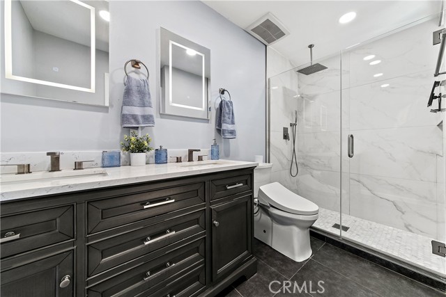 SELLER TO COVER UP TO 6 MONTHS OF HOA DUES FOR BUYER! Step through the door to volumes of light, soaring ceilings, and gleaming hardwood floors. A romantic electric fireplace anchors the living room, perfectly paired with a chic bar for easy entertaining. The heart of the home—a refreshed kitchen—combines a practical island with stainless steel appliances and an intimate dining area that keeps cooking and conversation connected. Upstairs, discover two generously sized primary suites, each with a fully renovated bathroom featuring modern fixtures; one suite adds the luxury of heated tile floors for crisp L.A. mornings. A convenient, updated powder room serves the lower level, and an in-unit laundry nook streamlines daily living. Open the door to a private, lush patio—your spot for morning coffee, evening wine, and effortless indoor–outdoor flow. Smart-home essentials include a Ring alarm system, smart locks, Nest thermostat, and dimmable LED recessed lighting, while dual-pane windows and a newer AC unit keep things comfortable and efficient year-round. Community perks deliver resort-style ease: low HOA fees including water and trash, plus a sparkling pool and hot tub just steps from your door. Park with confidence in two side-by-side subterranean garage spaces equipped with an electric car charger, direct unit access, and store everything neatly with two generous storage units. Location seals the deal—blocks to Ventura Boulevard and its constellation of cafés, eateries, Whole Foods, Starbucks, and boutique shopping. This is Tarzana living at its most convenient and comfortable.