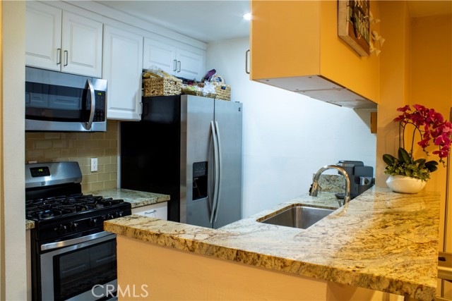 DO NOT MISS this unit in the popular resort-style GATED California Place complex in a very desirable area of Tarzana, freeway close and not far from Ventura Blvd, where shopping, dining and entertainment are in abundance. This darling first floor home is ideally located within the complex, and has an excellent floorplan, with pleasant relaxing space out on the private patio. The kitchen has gorgeous countertops, and BRAND-NEW stainless steel refrigerator, dishwasher & microwave. The full bathroom has been updated, and the bedroom is quite ample, with even more storage in the hallway closet. There's a dedicated parking space, with a gated entrance. The community's many amenities, many renovated in March 2023, include a pool, spa, and huge BBQ area. A beautiful two story clubhouse has a billiard table upstairs, and a kitchen, sauna, & gym to enjoy. If you're looking for a quality Tarzana condo community at a wonderful price and reasonable HOA fees, here it is!