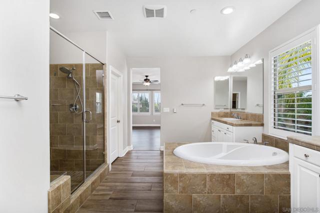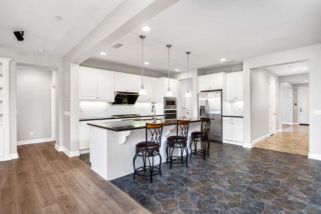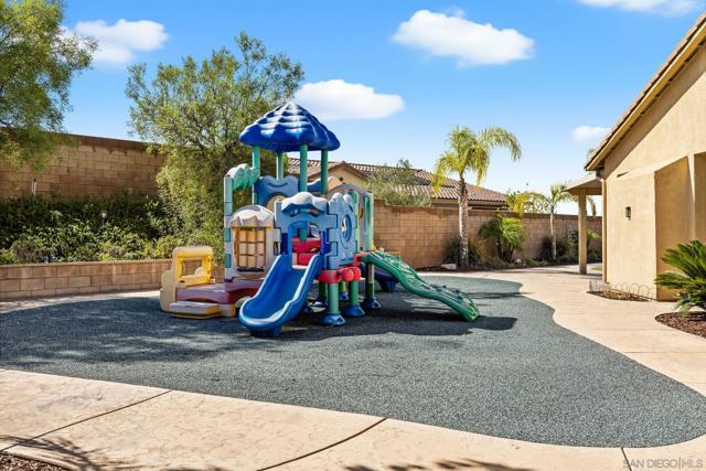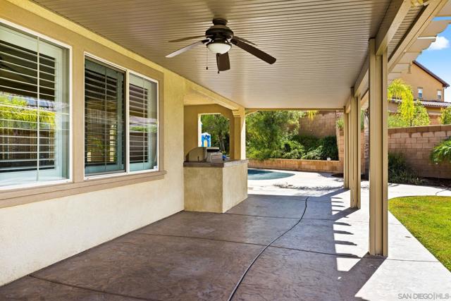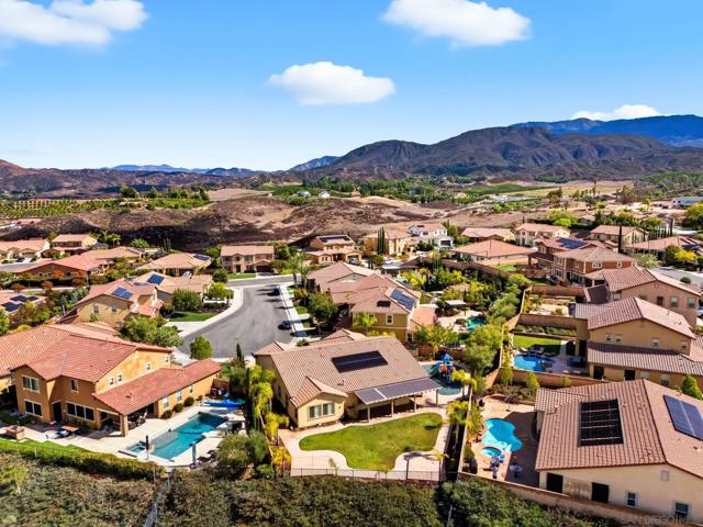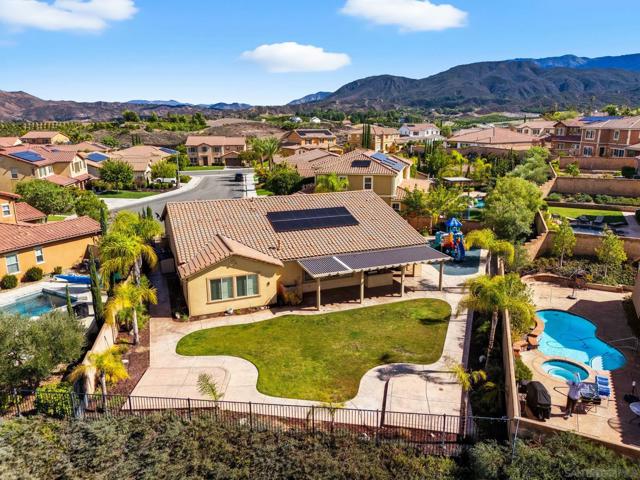 Discover this elegant single-story solar-powered home nestled on a 0.31-acre cul-de-sac lot in the desirable Morgan Hill community. With 2,929 sq. ft., 4 bedrooms, and 3 baths, this home offers spacious, comfortable living in a beautifully designed open floor plan. The living and dining areas feature built-in cabinetry, plantation shutters, and a fireplace with surround sound. The chef’s kitchen includes stainless steel appliances, a gas cooktop, granite countertops, tile backsplash, and a large island with breakfast seating plus a walk-in pantry. Three bedrooms are located in the front wing, including one with a private en-suite—ideal for guests. The primary suite at the rear enjoys panoramic Temecula Valley views, a luxurious bath with dual vanities, soaking tub, oversized shower, and walk-in closet. Enjoy outdoor living with a California room featuring a fireplace, built-in BBQ with stovetop, stamped concrete patio, extended shade cover, and playground area. Residents enjoy access to Morgan Hill’s private 3-acre recreation center with pool, spa, tennis, fitness center, and clubhouse. Conveniently located near shopping, dining, golf, and top-rated schools, this home combines elegance, energy efficiency, and resort-style living.