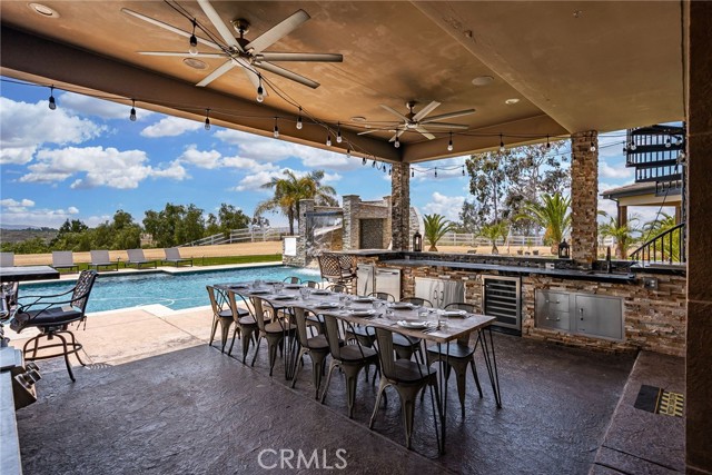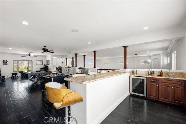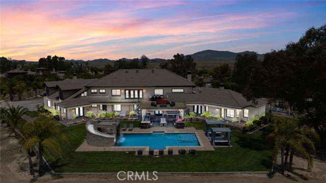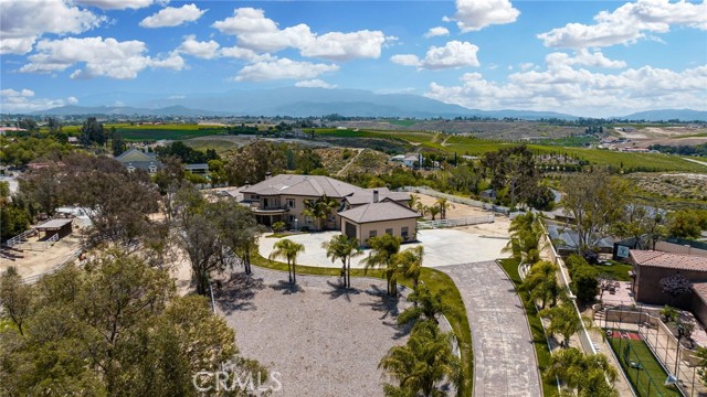Nestled on a quiet cul-de-sac in the heart of Temecula Wine Country, this extraordinary estate offers nearly 8,500 square feet of luxurious living space on over 2 acres, with breathtaking views and world-class amenities. Just a quarter-mile from the first winery and a short drive to Old Town Temecula, this home provides the perfect blend of privacy and convenience. The well-designed floor plan features eight bedrooms and nine bathrooms, including four bedrooms on the first floor, two of which have en-suite bathrooms, plus a separate laundry room. The second floor boasts three additional en-suite bedrooms, along with an attached ADU offering private backyard access, its own one-car garage, a dedicated staircase, a full kitchen, a living area, a bedroom, a bathroom, and a separate laundry room with washer/dryer hookups. Also on the second floor is a spacious balcony with a built-in bar, offering stunning views of the wineries and backyard. A spiral staircase connects the balcony to the backyard for seamless indoor-outdoor living. The third floor features a versatile bonus room or additional bedroom with a half bathroom, perfect for a private retreat or entertainment space. Exquisite craftsmanship is showcased throughout, featuring a grand wrought-iron staircase, crown molding, and elegant flooring. The gourmet kitchen is a chef’s dream, equipped with high-end Thermador appliances, a built-in refrigerator, dual dishwashers, and custom cabinetry. Designed for entertaining, the resort-style backyard is a paradise featuring a stunning pool with a waterfall, grotto, slide, and water features, plus a fully equipped outdoor kitchen with granite countertops, a pizza oven, BBQ, and more. The expansive six-car garage includes RV parking, a workshop area, an enclosed office or storage space, and a half bathroom. This exceptional estate is a must-see!