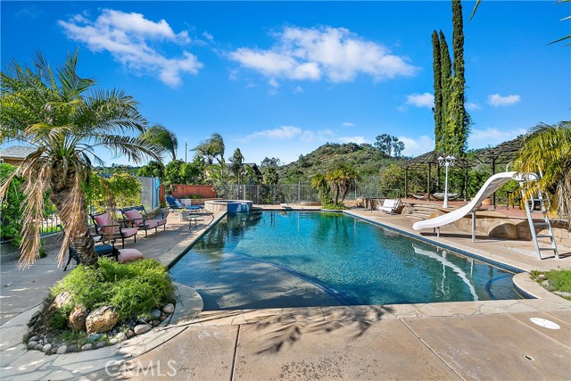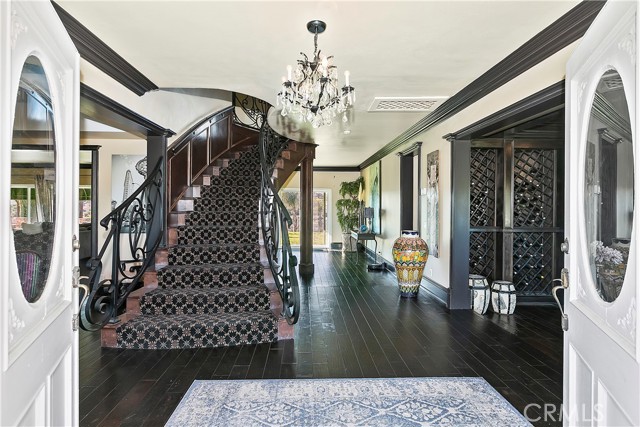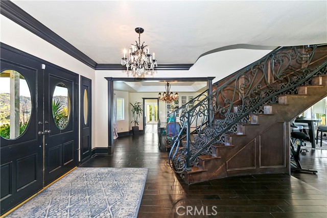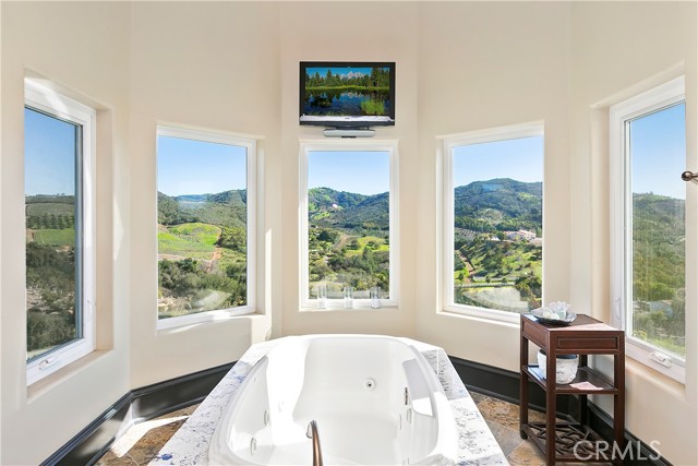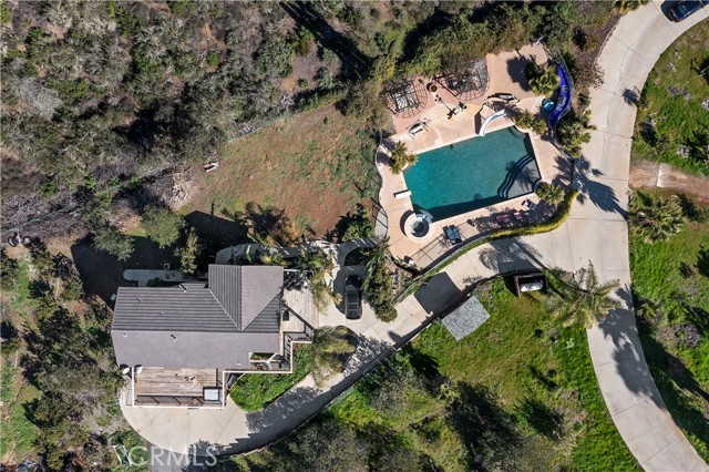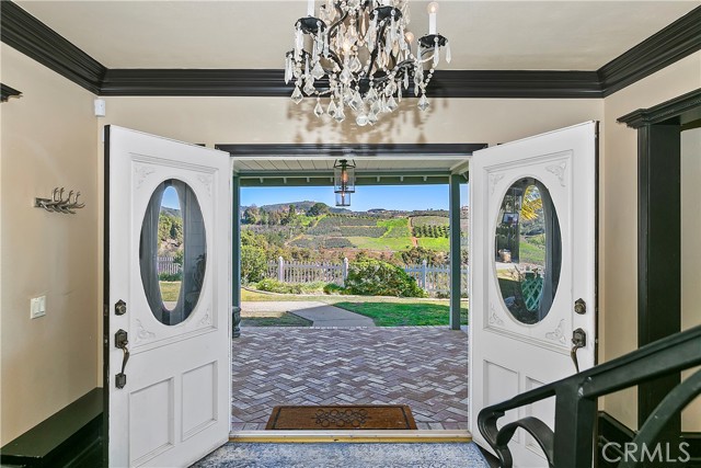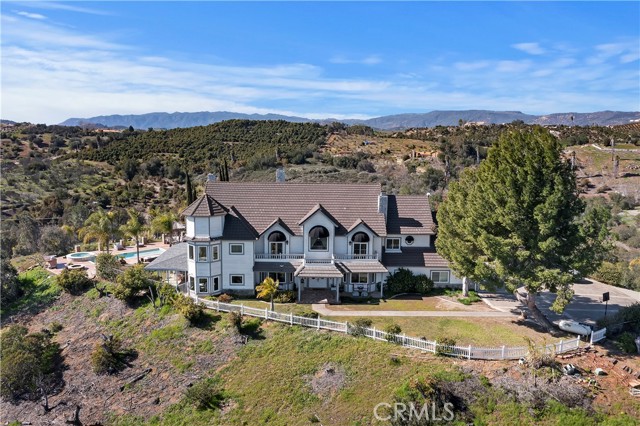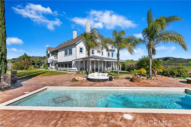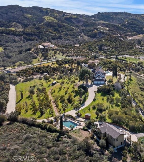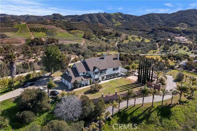 Luxury at its finest with this stunning De Luz Estate pool home. This gorgeous property also includes a 1200+ Sq. Ft. guest house with 2 bedrooms 2 bathrooms and a 2 car garage and pool of it own, all just minutes from Old Town Temecula, schools, shopping, dinning, freeway and entertainment. You will be in awe at the spectacular 360 degree views from every room throughout this stunning 4,861 sq. ft. estate home, positioned on a over 5+ acres of impressive land. As you drive up the private driveway, enjoying the breathtaking views, you'll come upon an orchard that consists of 14 mango and 19 grapefruit trees, you'll then pass by a lovely guest home, excellent potential rental opportunity or for guests, friends or family to live in. When entering the main home through the double front doors, you'll immediately appreciate it's grand scale, with the beautiful scrolling iron banister, coffered ceilings, exquisite woodwork, hardwood flooring, and open floor plan with every bedroom consisting of their own bathrooms. Enjoy a cozy evening by the fire, reading a book, or chatting with friends in the lounge/den with beautifully crafted full wall, wood, built-in wine racks and cabinets, granite counters, and wainscot throughout. This room is a must see! Looking to entertain, then you'll enjoy the huge family room, formal dining room and beautiful kitchen with eating area with never ending views. Need room for guests, no problem, down the hallway you'll find a bedroom with walk-in closet and a full bathroom. There is also a separate powder room conveniently located off of the family room and a gigantic laundry room with plenty of storage. Upstairs you will be stunned by the craftsmanship. The primary bedroom has its own retreat for reading or tv time and the master bedroom has a private 3 sided fireplace. Enjoy a spa day in the master bathroom with jetted tub facing overlooking the picturesque and never-ending views. There are 2 more bedrooms upstairs with stunning full bathrooms and cathedral ceilings, separate bonus area with balcony, and another bonus room with built-in desks and storage for playroom, home office or a plethora of other uses. The backyard of this stunner consists of a pool and spa, BBQ and firepit. Sit by the fire and enjoy the stars with your unobstructed view. Looking to have some animals, there is plenty of room for barn, gardens, vines, pickleball court, or whatever you heart desires.