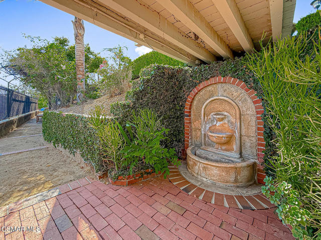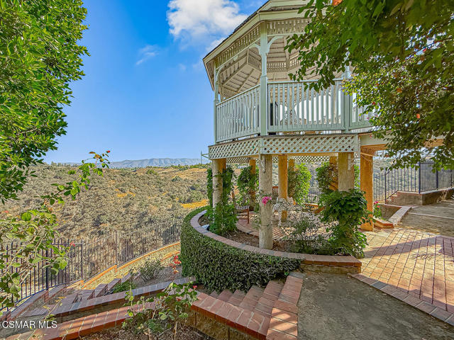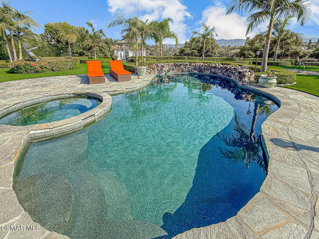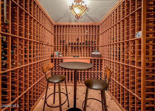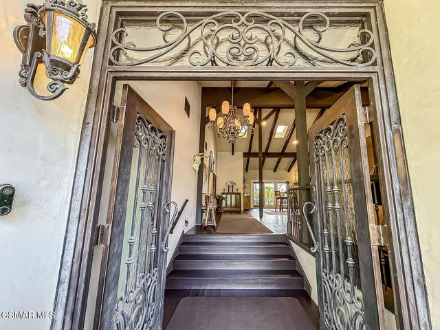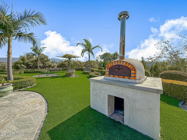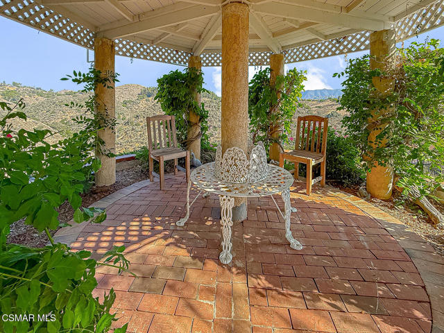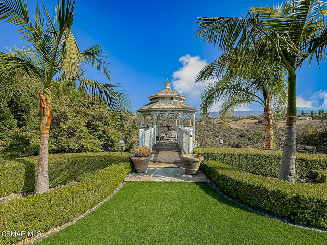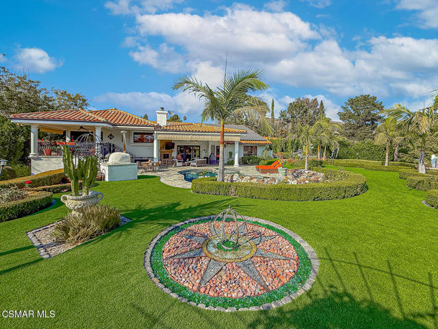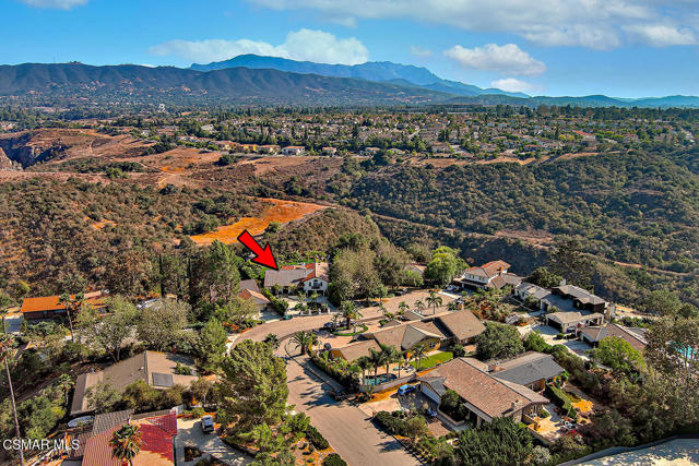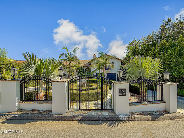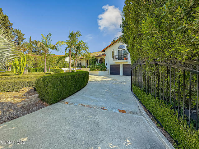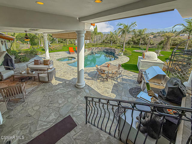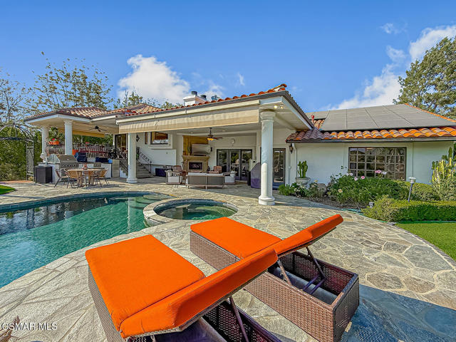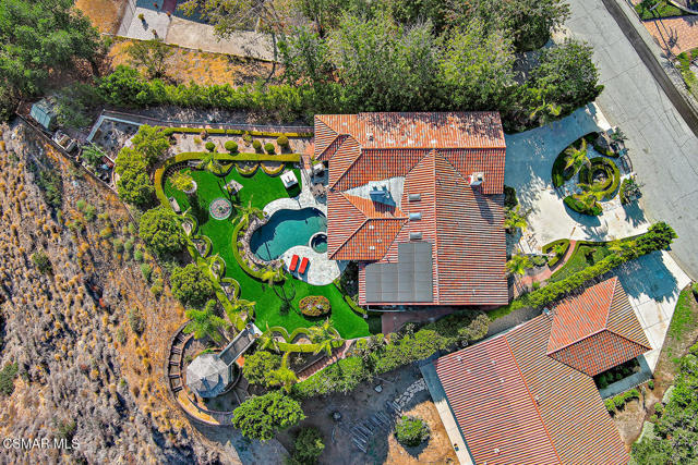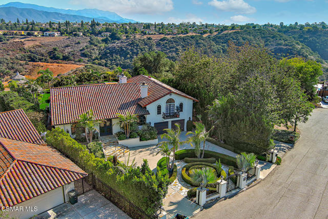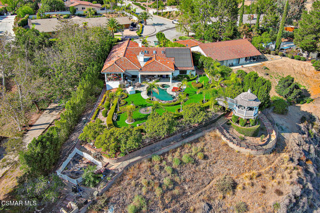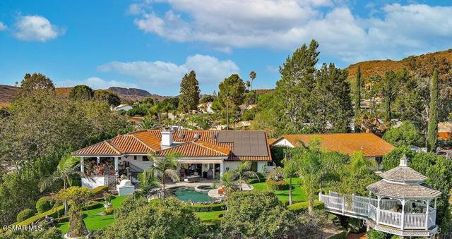 LOOK AT THIS ENTERTAINER'S DREAM OF A YARD!!Nestled in the exclusive neighborhood of Lynn Ranch, this home offers the tranquility of a cul-de-sac location in addition to the dramatic surroundings of serene canyon views and a running stream. Located on an approx. 25,000 sq. ft. lot and a house which is about 3,800 sq. ft. ~It is set back from the street accessed by an automatic dual gate and circular driveway. Not only is there a deep 2 car garage, there is enough parking for 5+ cars. This property combines rustic elegance with wood beams and stone fireplaces with luxurious amenities: secret wine cellar, saltwater pool/spa and a gourmet kitchen.Once you enter through the massive iron doors you look up at a beautiful 2 story vaulted ceiling. The gourmet kitchen with panoramic views ~ is well equipped with high end appliances (Sub-Zero, 2 ovens, glass front cabinets, an island and a deep custom sink). This home also includes modern green-features: a SOLAR SYSTEM owned by the seller (no lease) with a battery backup system-4 batteries included- All 3 baths have been remodeled~ the ensuite bath to the primary bedroom is exquisite! (Much like your own spa). The tile throughout in all 3 baths is gorgeous. Outdoor entertaining is absolutely a standout for you and any parties. There is a saltwater pool/spa, an upper terrace for dining and a lower patio complete with stainless steel built ins. To complete the dining experience there is a pizza oven! This lot is beautifully landscaped featuring lush gardens, walkways, a greenhouse, fabulous gazebo and views out to the canyon and enchanting stream below. The property backs onto the Arroyo Canyon Natural Area. The views are expansive and the sunsets dramatic! When you combine the large view lot, high end finishes, and the solar system you have a truly distinctive upscale property in Thousand Oaks-- and one you should come and preview! You will never want to leave!