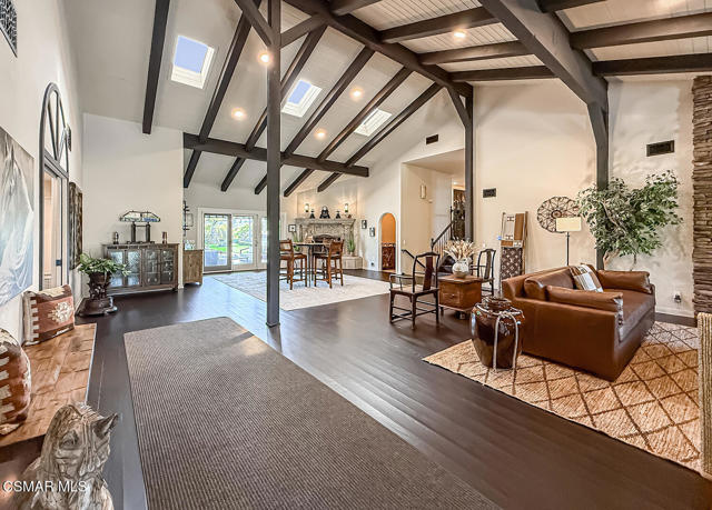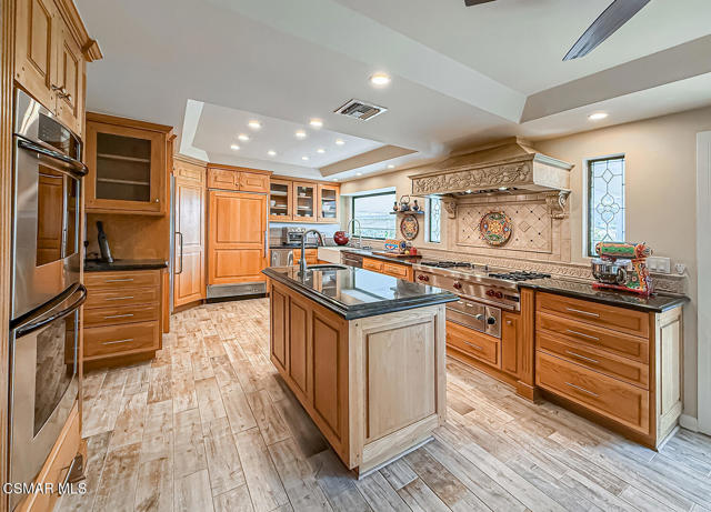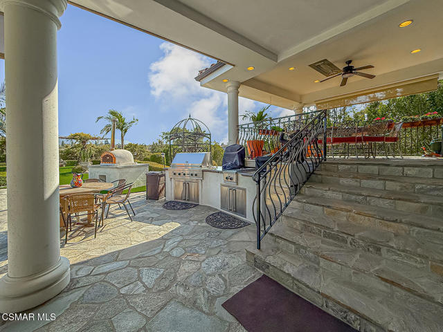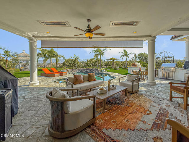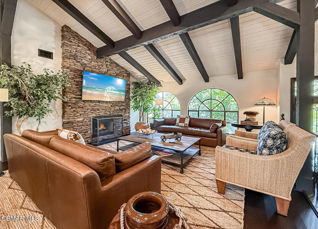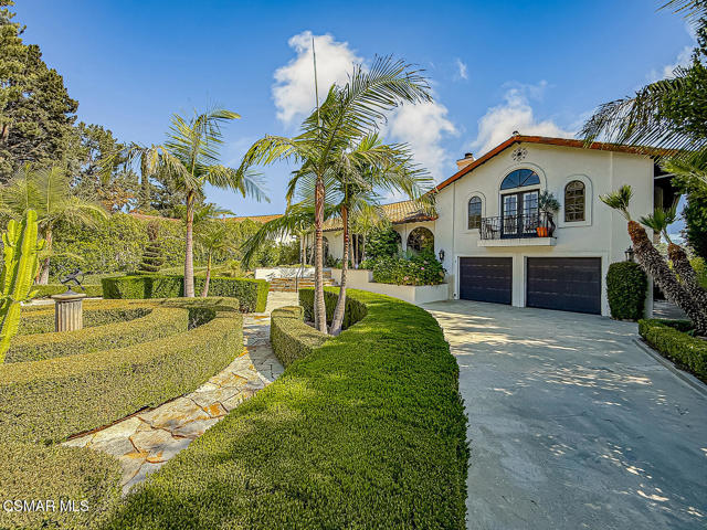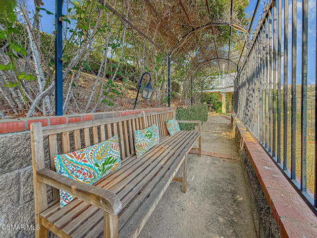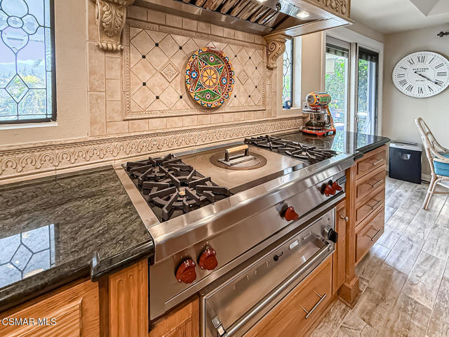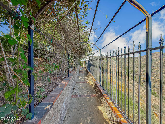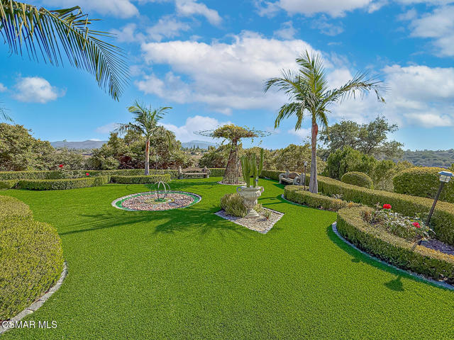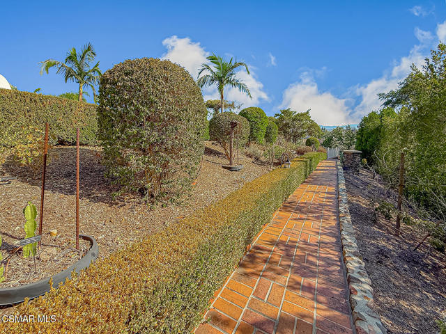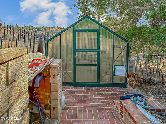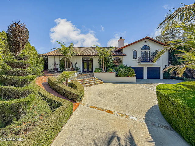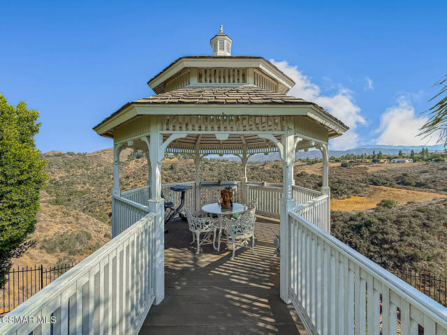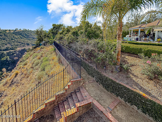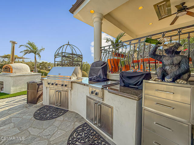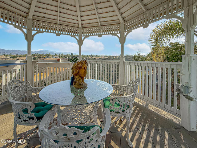 LOOK AT THIS ENTERTAINER'S DREAM OF A YARD!!Nestled in the exclusive neighborhood of Lynn Ranch, this home offers the tranquility of a cul-de-sac location in addition to the dramatic surroundings of serene canyon views and a running stream. Located on an approx. 25,000 sq. ft. lot and a house which is about 3,800 sq. ft. ~It is set back from the street accessed by an automatic dual gate and circular driveway. Not only is there a deep 2 car garage, there is enough parking for 5+ cars. This property combines rustic elegance with wood beams and stone fireplaces with luxurious amenities: secret wine cellar, saltwater pool/spa and a gourmet kitchen.Once you enter through the massive iron doors you look up at a beautiful 2 story vaulted ceiling. The gourmet kitchen with panoramic views ~ is well equipped with high end appliances (Sub-Zero, 2 ovens, glass front cabinets, an island and a deep custom sink). This home also includes modern green-features: a SOLAR SYSTEM owned by the seller (no lease) with a battery backup system-4 batteries included- All 3 baths have been remodeled~ the ensuite bath to the primary bedroom is exquisite! (Much like your own spa). The tile throughout in all 3 baths is gorgeous. Outdoor entertaining is absolutely a standout for you and any parties. There is a saltwater pool/spa, an upper terrace for dining and a lower patio complete with stainless steel built ins. To complete the dining experience there is a pizza oven! This lot is beautifully landscaped featuring lush gardens, walkways, a greenhouse, fabulous gazebo and views out to the canyon and enchanting stream below. The property backs onto the Arroyo Canyon Natural Area. The views are expansive and the sunsets dramatic! When you combine the large view lot, high end finishes, and the solar system you have a truly distinctive upscale property in Thousand Oaks-- and one you should come and preview! You will never want to leave!