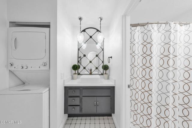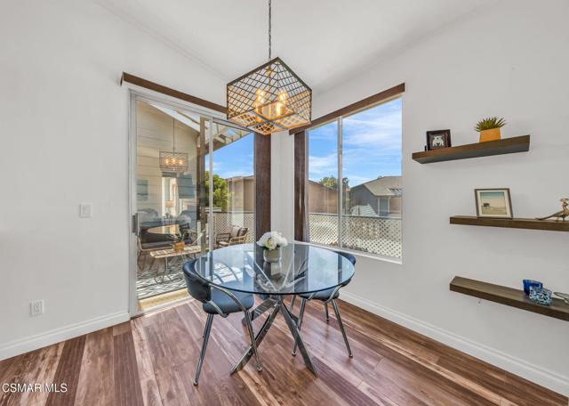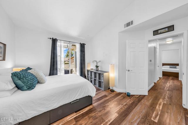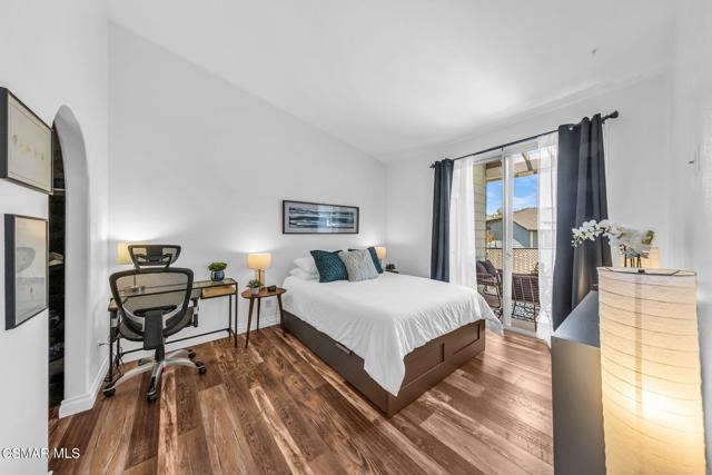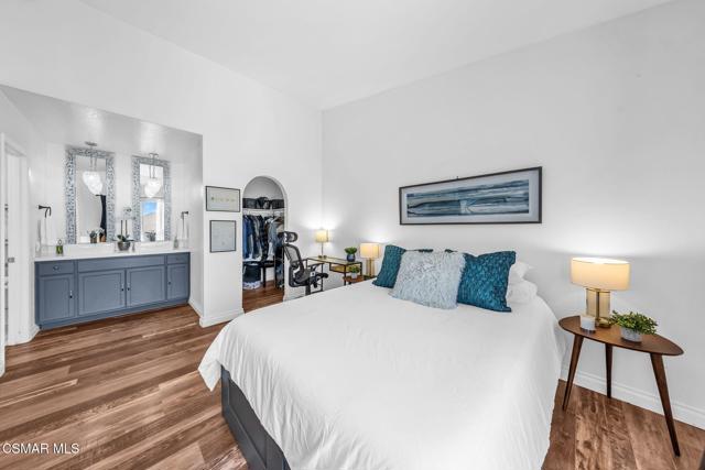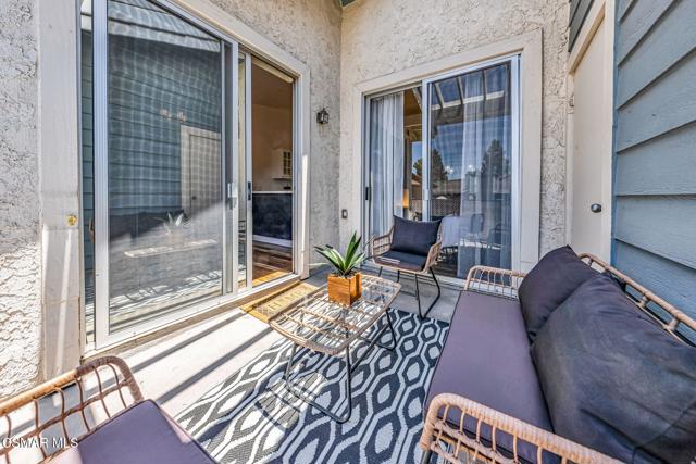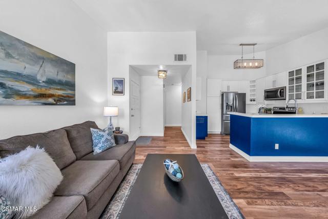 Great location! Gorgeously appointed 2 bedroom, 1 and 1/4 bath Camelot condo, centrally located in Thousand Oaks, blocks away from Gardens of the World, the Thousand Oaks Civic Arts Center, Mastro's Steakhouse and The Lakes Shopping Center. This unit is situated on the second level facing a quiet interior courtyard, surrounded by well-maintained grounds and trees, and conveniently close to the park, pool and spa. As you enter, you'll immediately feel the warmth of this home and are greeted by vaulted ceilings, beautiful flooring and sparkling fixtures. The updated kitchen offers plenty of counter space and storage, plus a bar that seats 4. Rich wood-like flooring is throughout and provides an open flow to the bedrooms. The primary offers a custom arched walk-in closet . A slider door from the primary opens to the large wrap-around patio that can also be accessed from the living room. The shared bathroom offers separate vanities, on opposite ends of the bathroom. This unit also offers privacy, peek-a-boo mountain views and a newer HVAC system (2023). What a gem of a home! Camelot is an owner-occupied condo complex. HOA includes water, trash, and one covered assigned parking spot.