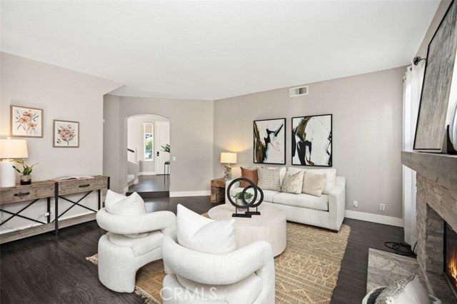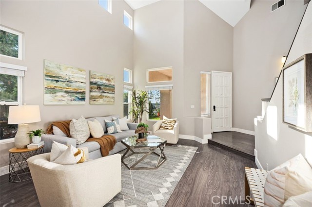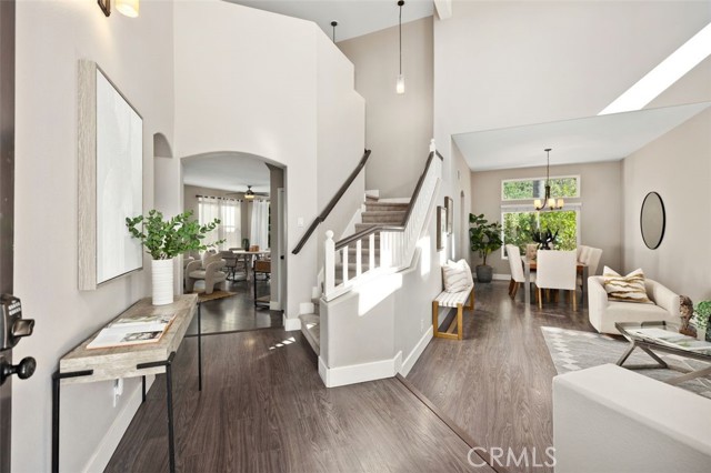 Beautifully updated Dove Canyon Gem! Enjoy all that prestigious Dove Canyon has to offer at 28 Lawnridge, a beautiful modern residence perched on a corner lot near the top of this coveted gated golf community in the foothills of Trabuco Canyon. This popular 4-bedroom floorplan (3 bedrooms and a large bonus room) has abundant natural light, an open layout, and is beautifully updated with luxurious surfaces and a modern neutral palette. As you enter, you'll find cathedral ceilings, elegant laminate flooring, an inviting living room, a dining room and family room with fireplace, guest bath and spacious laundry room. The kitchen has been tastefully remodeled with quartz countertops & custom tile backsplash, center island with a statement light fixture, gas cooktop, wall oven and built-in microwave. Upstairs, a luxe primary suite awaits with cathedral ceilings, ensuite bath & dual sinks, separate shower and soaking tub, and walk-in closet. Two large secondary bedrooms, an additional full bath, linen storage and an oversized bonus room complete the second floor layout. The entertainer's rear yard is ideal for year-round outdoor living, with a patio, firepit, low maintenance turf area, trees and more. An energy-saving whole house fan eases your energy usage, HVAC and water heater were recently replaced, and the garage is equipped with a 240-volt Tesla charger that is compatible with all electric car models. The world-class amenities of Dove Canyon will be yours, with tennis, pickleball, a resort-style pool complex, 24-hour security and guarded gate, plus a variety of golf and social memberships available for the Dove Canyon golf club. Welcome home!