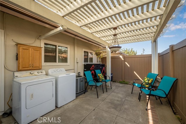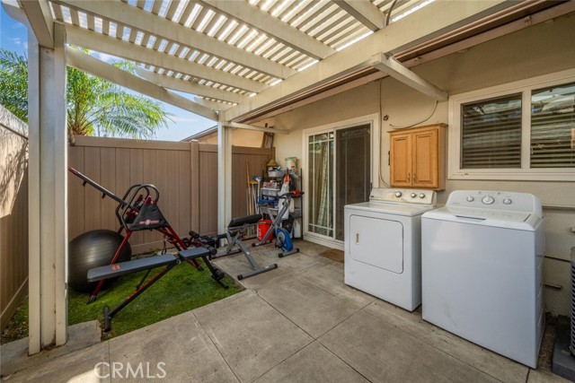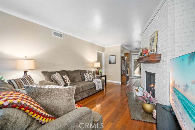Welcome to the charming community of Tree Haven, where you’ll discover this delightful and truly move-in ready single-level home featuring 1 bedroom and 1 bathroom. Tucked away as a desirable corner unit amidst beautiful Jacaranda and Crepe Myrtle trees, this residence offers both comfort and charm. Step inside to find a spacious living room with hardwood floors and a versatile layout that includes a cozy area perfect for a home office overlooking the lush garden setting. A classic brick, wood-burning fireplace creates a warm focal point for the living space. The updated kitchen features matching white appliances—including a microwave and gas oven—paired with crisp cabinetry and granite counters. Adjacent to the kitchen, the dining area offers generous wall space ideal for a sideboard or additional storage. A sliding glass door leads to your private backyard oasis, complete with a wood-style metal patio cover adorned with a chandelier and surrounded by low-maintenance vinyl fencing—perfect for outdoor entertaining. Down the hall, you’ll find a spacious bedroom with dual mirrored closets, providing excellent storage. The bathroom has been tastefully remodeled with a tiled walk-in shower and a refreshed vanity. Additional highlights include 1 garaged parking space with storage cabinets, central HVAC, in-unit washer and dryer, smooth ceilings, and dual-pane windows throughout. Tree Haven offers beautifully maintained grounds with two pools and two clubhouses for residents to enjoy. Conveniently located in a wonderful part of Tustin, you’ll find restaurants, shopping, and everyday amenities just a short stroll away. This is truly a turnkey home in an exceptional community—ready for you to move in and start living your best life!
