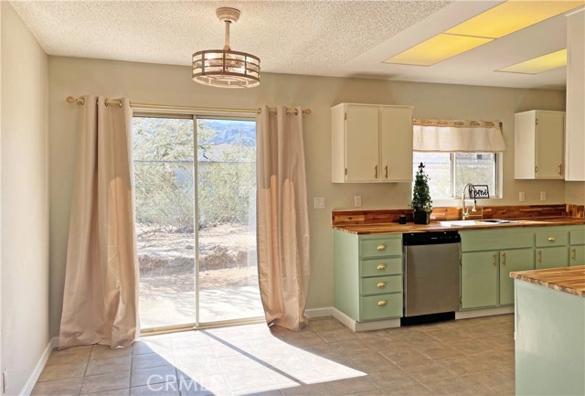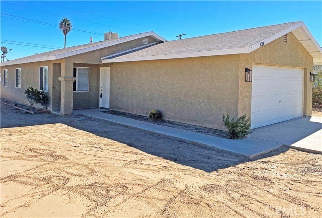Fresh, Thoughtful Upgrades Throughout. This refreshed desert-style home features 3 bedrooms, 2 bathrooms, and about 1,248 square feet of upgraded, light-filled living space. Perched near Joshua Tree National Park and located close to the Chocolate Drop area, this home captures the soulful beauty of high-desert living. Step across gorgeous new flooring that flows from room to room, uniting the interior with modern elegance and ease of care. New blinds add clean, adjustable light control and privacy, balancing bright desert sunshine with serene interiors. The interior has been freshly painted in neutral tones, offering a calm, clean, and timeless backdrop that enhances the bright, airy feel. Throughout the home, new ceiling fans have been installed — stylish, efficient, and helping to circulate air for comfortable living during warm desert days and nights. Brand-new closet doors bring upgraded organization and storage to everyday life. In the heart of the home, the kitchen is elevated by a warm, character-rich butcher block counter-top, offering a timeless surface that’s both stylish and functional. The bathrooms shine with new vanities and new toilets, each fitting seamlessly into the home’s refreshed aesthetic. The property includes a finished, attached two-car garage — clean, functional, and seamlessly connected to the home. Whether for vehicles, storage, or workshop needs, this garage adds convenience and utility. The yard has been regraded, smoothing out slopes, improving drainage, and creating a clean slate for your landscaping vision. With no existing landscaping in place, this space invites you to shape it as you please — be it minimal desert design, rock gardens, seating zones, or pathways that accentuate the views. A central ducted evaporative cooler ensures cool, comfortable air throughout the home during warmer desert months. Schedule a tour today!